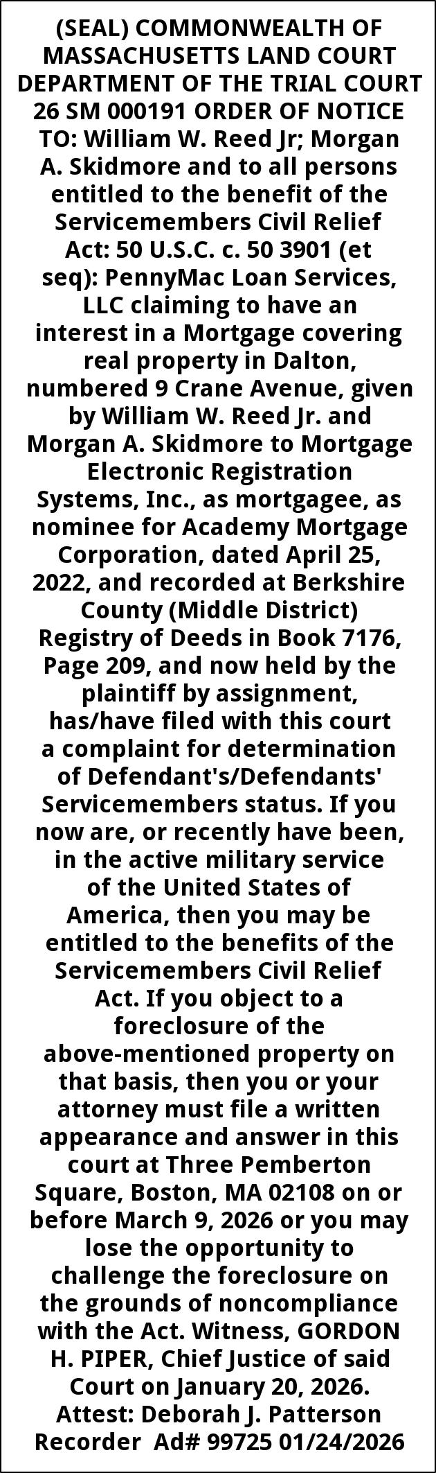 (SEAL) COMMONWEALTH OF MASSACHUSETTS LAND COURT DEPARTMENT OF THE TRIAL COURT 26 SM 000191 ORDER OF NOTICE TO: William W. Reed Jr; Morgan A. Skidmore and to all persons entitled to the benefit of the Servicemembers Civil Relief Act: 50 U.S.C. c. 50 3901 (et seq): PennyMac Loan Services, LLC claiming to have an interest in a Mortgage covering real property in Dalton, numbered 9 Crane Avenue, given by William W. Reed Jr. and Morgan A. Skidmore to Mortgage Electronic Registration Systems, Inc., as mortgagee, as nominee for Academy Mortgage Corporation, dated April 25, 2022, and recorded at Berkshire County (Middle District) Registry of Deeds in Book 7176, Page 209, and now held by the plaintiff by assignment, has/have filed with this court a complaint for determination of Defendant's/Defendants' Servicemembers status. If you now are, or recently have been, in the active military service of the United States of America, then you may be entitled to the benefits of the Servicemembers Civil Relief Act. If you object to a foreclosure of the above-mentioned property on that basis, then you or your attorney must file a written appearance and answer in this court at Three Pemberton Square, Boston, MA 02108 on or before March 9, 2026 or you may lose the opportunity to challenge the foreclosure on the grounds of noncompliance with the Act. Witness, GORDON H. PIPER, Chief Justice of said Court on January 20, 2026. Attest: Deborah J. Patterson Recorder Ad# 99725 01/24/2026