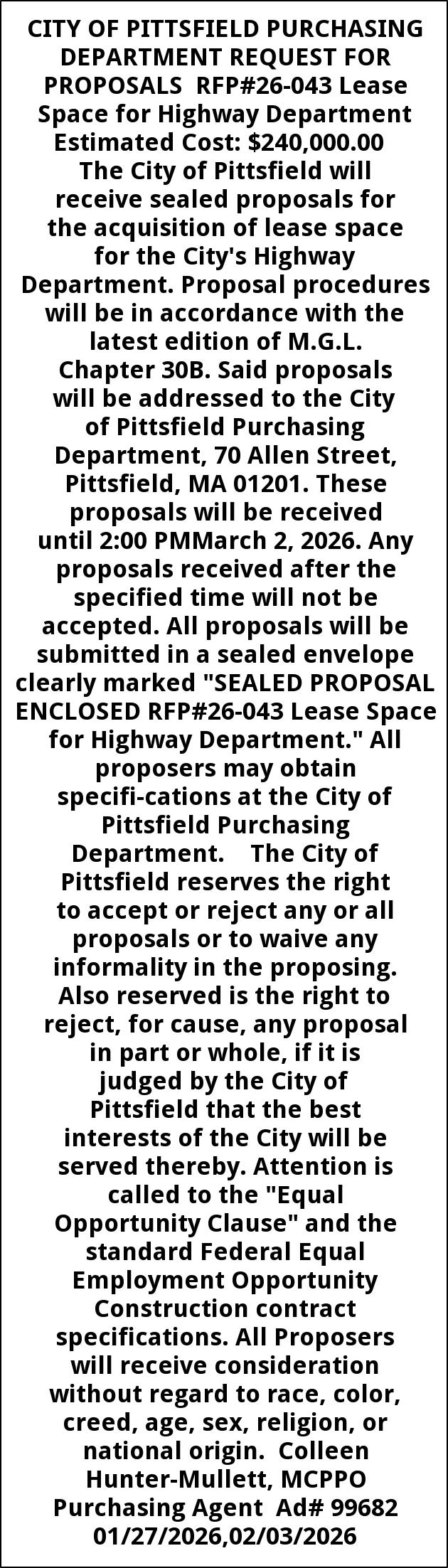 CITY OF PITTSFIELD PURCHASING DEPARTMENT REQUEST FOR PROPOSALS RFP#26-043 Lease Space for Highway Department Estimated Cost: $240,000.00 The City of Pittsfield will receive sealed proposals for the acquisition of lease space for the City's Highway Department. Proposal procedures will be in accordance with the latest edition of M.G.L. Chapter 30B. Said proposals will be addressed to the City of Pittsfield Purchasing Department, 70 Allen Street, Pittsfield, MA 01201. These proposals will be received until 2:00 PMMarch 2, 2026. Any proposals received after the specified time will not be accepted. All proposals will be submitted in a sealed envelope clearly marked "SEALED PROPOSAL ENCLOSED RFP#26-043 Lease Space for Highway Department." All proposers may obtain specifi-cations at the City of Pittsfield Purchasing Department. The City of Pittsfield reserves the right to accept or reject any or all proposals or to waive any informality in the proposing. Also reserved is the right to reject, for cause, any proposal in part or whole, if it is judged by the City of Pittsfield that the best interests of the City will be served thereby. Attention is called to the "Equal Opportunity Clause" and the standard Federal Equal Employment Opportunity Construction contract specifications. All Proposers will receive consideration without regard to race, color, creed, age, sex, religion, or national origin. Colleen Hunter-Mullett, MCPPO Purchasing Agent Ad# 99682 01/27/2026,02/03/2026
