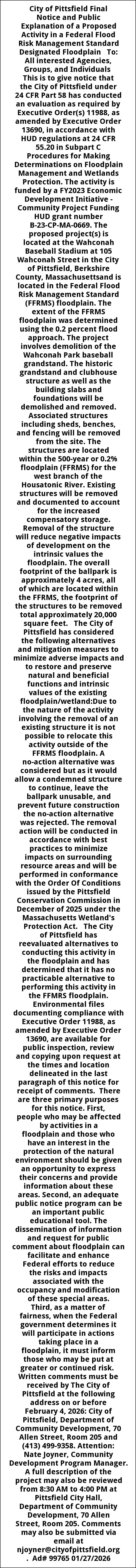 City of Pittsfield Final Notice and Public Explanation of a Proposed Activity in a Federal Flood Risk Management Standard Designated Floodplain To: All interested Agencies, Groups, and Individuals This is to give notice that the City of Pittsfield under 24 CFR Part 58 has conducted an evaluation as required by Executive Order(s) 11988, as amended by Executive Order 13690, in accordance with HUD regulations at 24 CFR 55.20 in Subpart C Procedures for Making Determinations on Floodplain Management and Wetlands Protection. The activity is funded by a FY2023 Economic Development Initiative - Community Project Funding HUD grant number B-23-CP-MA-0669. The proposed project(s) is located at the Wahconah Baseball Stadium at 105 Wahconah Street in the City of Pittsfield, Berkshire County, Massachusettsand is located in the Federal Flood Risk Management Standard (FFRMS) floodplain. The extent of the FFRMS floodplain was determined using the 0.2 percent flood approach. The project involves demolition of the Wahconah Park baseball grandstand. The historic grandstand and clubhouse structure as well as the building slabs and foundations will be demolished and removed. Associated structures including sheds, benches, and fencing will be removed from the site. The structures are located within the 500-year or 0.2% floodplain (FFRMS) for the west branch of the Housatonic River. Existing structures will be removed and documented to account for the increased compensatory storage. Removal of the structure will reduce negative impacts of development on the intrinsic values the floodplain. The overall footprint of the ballpark is approximately 4 acres, all of which are located within the FFRMS, the footprint of the structures to be removed total approximately 20,000 square feet. The City of Pittsfield has considered the following alternatives and mitigation measures to minimize adverse impacts and to restore and preserve natural and beneficial functions and intrinsic values of the existing floodplain/wetland:Due to the nature of the activity involving the removal of an existing structure it is not possible to relocate this activity outside of the FFRMS floodplain. A no-action alternative was considered but as it would allow a condemned structure to continue, leave the ballpark unusable, and prevent future construction the no-action alternative was rejected. The removal action will be conducted in accordance with best practices to minimize impacts on surrounding resource areas and will be performed in conformance with the Order Of Conditions issued by the Pittsfield Conservation Commission in December of 2025 under the Massachusetts Wetland's Protection Act. The City of Pittsfield has reevaluated alternatives to conducting this activity in the floodplain and has determined that it has no practicable alternative to performing this activity in the FFMRS floodplain. Environmental files documenting compliance with Executive Order 11988, as amended by Executive Order 13690, are available for public inspection, review and copying upon request at the times and location delineated in the last paragraph of this notice for receipt of comments. There are three primary purposes for this notice. First, people who may be affected by activities in a floodplain and those who have an interest in the protection of the natural environment should be given an opportunity to express their concerns and provide information about these areas. Second, an adequate public notice program can be an important public educational tool. The dissemination of information and request for public comment about floodplain can facilitate and enhance Federal efforts to reduce the risks and impacts associated with the occupancy and modification of these special areas. Third, as a matter of fairness, when the Federal government determines it will participate in actions taking place in a floodplain, it must inform those who may be put at greater or continued risk. Written comments must be received by The City of Pittsfield at the following address on or before February 4, 2026: City of Pittsfield, Department of Community Development, 70 Allen Street, Room 205 and (413) 499-9358. Attention: Nate Joyner, Community Development Program Manager. A full description of the project may also be reviewed from 8:30 AM to 4:00 PM at Pittsfield City Hall, Department of Community Development, 70 Allen Street, Room 205. Comments may also be submitted via email at njoyner@cityofpittsfield.org. Ad# 99765 01/27/2026