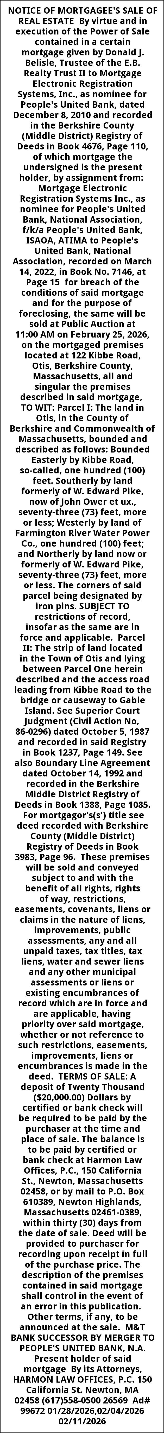 NOTICE OF MORTGAGEE'S SALE OF REAL ESTATE By virtue and in execution of the Power of Sale contained in a certain mortgage given by Donald J. Belisle, Trustee of the E.B. Realty Trust II to Mortgage Electronic Registration Systems, Inc., as nominee for People's United Bank, dated December 8, 2010 and recorded in the Berkshire County (Middle District) Registry of Deeds in Book 4676, Page 110, of which mortgage the undersigned is the present holder, by assignment from: Mortgage Electronic Registration Systems Inc., as nominee for People's United Bank, National Association, f/k/a People's United Bank, ISAOA, ATIMA to People's United Bank, National Association, recorded on March 14, 2022, in Book No. 7146, at Page 15 for breach of the conditions of said mortgage and for the purpose of foreclosing, the same will be sold at Public Auction at 11:00 AM on February 25, 2026, on the mortgaged premises located at 122 Kibbe Road, Otis, Berkshire County, Massachusetts, all and singular the premises described in said mortgage, TO WIT: Parcel I: The land in Otis, in the County of Berkshire and Commonwealth of Massachusetts, bounded and described as follows: Bounded Easterly by Kibbe Road, so-called, one hundred (100) feet. Southerly by land formerly of W. Edward Pike, now of John Ower et ux., seventy-three (73) feet, more or less; Westerly by land of Farmington River Water Power Co., one hundred (100) feet; and Northerly by land now or formerly of W. Edward Pike, seventy-three (73) feet, more or less. The corners of said parcel being designated by iron pins. SUBJECT TO restrictions of record, insofar as the same are in force and applicable. Parcel II: The strip of land located in the Town of Otis and lying between Parcel One herein described and the access road leading from Kibbe Road to the bridge or causeway to Gable Island. See Superior Court Judgment (Civil Action No, 86-0296) dated October 5, 1987 and recorded in said Registry in Book 1237, Page 149. See also Boundary Line Agreement dated October 14, 1992 and recorded in the Berkshire Middle District Registry of Deeds in Book 1388, Page 1085. For mortgagor's(s') title see deed recorded with Berkshire County (Middle District) Registry of Deeds in Book 3983, Page 96. These premises will be sold and conveyed subject to and with the benefit of all rights, rights of way, restrictions, easements, covenants, liens or claims in the nature of liens, improvements, public assessments, any and all unpaid taxes, tax titles, tax liens, water and sewer liens and any other municipal assessments or liens or existing encumbrances of record which are in force and are applicable, having priority over said mortgage, whether or not reference to such restrictions, easements, improvements, liens or encumbrances is made in the deed. TERMS OF SALE: A deposit of Twenty Thousand ($20,000.00) Dollars by certified or bank check will be required to be paid by the purchaser at the time and place of sale. The balance is to be paid by certified or bank check at Harmon Law Offices, P.C., 150 California St., Newton, Massachusetts 02458, or by mail to P.O. Box 610389, Newton Highlands, Massachusetts 02461-0389, within thirty (30) days from the date of sale. Deed will be provided to purchaser for recording upon receipt in full of the purchase price. The description of the premises contained in said mortgage shall control in the event of an error in this publication. Other terms, if any, to be announced at the sale. M&T BANK SUCCESSOR BY MERGER TO PEOPLE'S UNITED BANK, N.A. Present holder of said mortgage By its Attorneys, HARMON LAW OFFICES, P.C. 150 California St. Newton, MA 02458 (617)558-0500 26569 Ad# 99672 01/28/2026,02/04/2026 02/11/2026