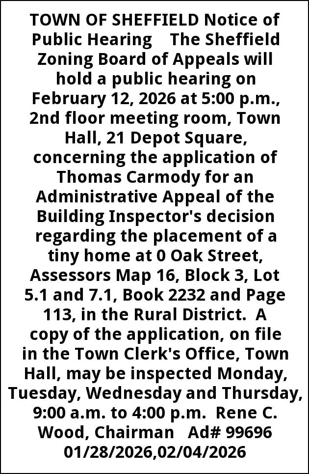 TOWN OF SHEFFIELD Notice of Public Hearing The Sheffield Zoning Board of Appeals will hold a public hearing on February 12, 2026 at 5:00 p.m., 2nd floor meeting room, Town Hall, 21 Depot Square, concerning the application of Thomas Carmody for an Administrative Appeal of the Building Inspector's decision regarding the placement of a tiny home at 0 Oak Street, Assessors Map 16, Block 3, Lot 5.1 and 7.1, Book 2232 and Page 113, in the Rural District. A copy of the application, on file in the Town Clerk's Office, Town Hall, may be inspected Monday, Tuesday, Wednesday and Thursday, 9:00 a.m. to 4:00 p.m. Rene C. Wood, Chairman Ad# 99696 01/28/2026,02/04/2026