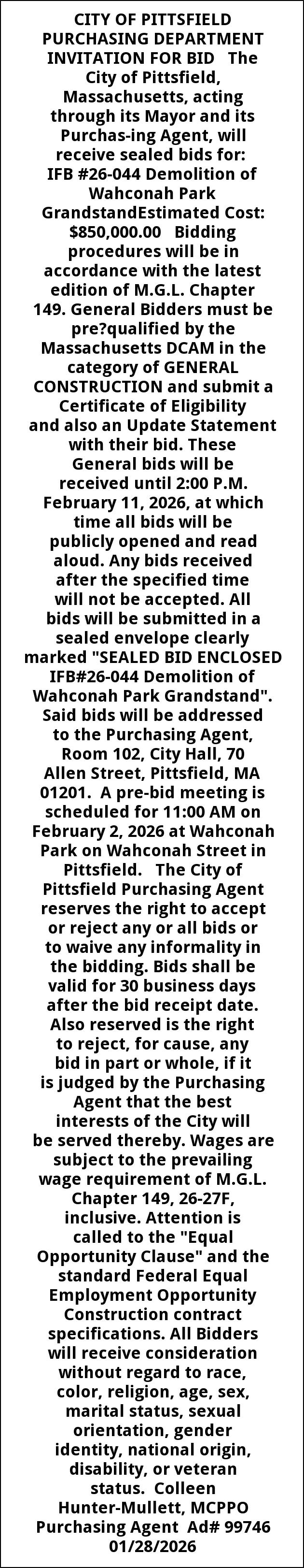 CITY OF PITTSFIELD PURCHASING DEPARTMENT INVITATION FOR BID The City of Pittsfield, Massachusetts, acting through its Mayor and its Purchas-ing Agent, will receive sealed bids for: IFB #26-044 Demolition of Wahconah Park GrandstandEstimated Cost: $850,000.00 Bidding procedures will be in accordance with the latest edition of M.G.L. Chapter 149. General Bidders must be pre?qualified by the Massachusetts DCAM in the category of GENERAL CONSTRUCTION and submit a Certificate of Eligibility and also an Update Statement with their bid. These General bids will be received until 2:00 P.M. February 11, 2026, at which time all bids will be publicly opened and read aloud. Any bids received after the specified time will not be accepted. All bids will be submitted in a sealed envelope clearly marked "SEALED BID ENCLOSED IFB#26-044 Demolition of Wahconah Park Grandstand". Said bids will be addressed to the Purchasing Agent, Room 102, City Hall, 70 Allen Street, Pittsfield, MA 01201. A pre-bid meeting is scheduled for 11:00 AM on February 2, 2026 at Wahconah Park on Wahconah Street in Pittsfield. The City of Pittsfield Purchasing Agent reserves the right to accept or reject any or all bids or to waive any informality in the bidding. Bids shall be valid for 30 business days after the bid receipt date. Also reserved is the right to reject, for cause, any bid in part or whole, if it is judged by the Purchasing Agent that the best interests of the City will be served thereby. Wages are subject to the prevailing wage requirement of M.G.L. Chapter 149, 26-27F, inclusive. Attention is called to the "Equal Opportunity Clause" and the standard Federal Equal Employment Opportunity Construction contract specifications. All Bidders will receive consideration without regard to race, color, religion, age, sex, marital status, sexual orientation, gender identity, national origin, disability, or veteran status. Colleen Hunter-Mullett, MCPPO Purchasing Agent Ad# 99746 01/28/2026