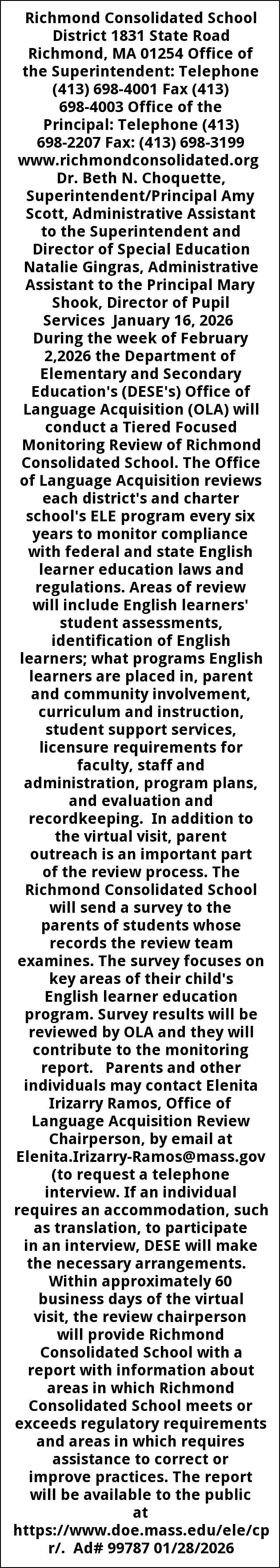 Richmond Consolidated School District 1831 State Road Richmond, MA 01254 Office of the Superintendent: Telephone (413) 698-4001 Fax (413) 698-4003 Office of the Principal: Telephone (413) 698-2207 Fax: (413) 698-3199 www.richmondconsolidated.org Dr. Beth N. Choquette, Superintendent/Principal Amy Scott, Administrative Assistant to the Superintendent and Director of Special Education Natalie Gingras, Administrative Assistant to the Principal Mary Shook, Director of Pupil Services January 16, 2026 During the week of February 2,2026 the Department of Elementary and Secondary Education's (DESE's) Office of Language Acquisition (OLA) will conduct a Tiered Focused Monitoring Review of Richmond Consolidated School. The Office of Language Acquisition reviews each district's and charter school's ELE program every six years to monitor compliance with federal and state English learner education laws and regulations. Areas of review will include English learners' student assessments, identification of English learners; what programs English learners are placed in, parent and community involvement, curriculum and instruction, student support services, licensure requirements for faculty, staff and administration, program plans, and evaluation and recordkeeping. In addition to the virtual visit, parent outreach is an important part of the review process. The Richmond Consolidated School will send a survey to the parents of students whose records the review team examines. The survey focuses on key areas of their child's English learner education program. Survey results will be reviewed by OLA and they will contribute to the monitoring report. Parents and other individuals may contact Elenita Irizarry Ramos, Office of Language Acquisition Review Chairperson, by email at Elenita.Irizarry-Ramos@mass.gov (to request a telephone interview. If an individual requires an accommodation, such as translation, to participate in an interview, DESE will make the necessary arrangements. Within approximately 60 business days of the virtual visit, the review chairperson will provide Richmond Consolidated School with a report with information about areas in which Richmond Consolidated School meets or exceeds regulatory requirements and areas in which requires assistance to correct or improve practices. The report will be available to the public at https://www.doe.mass.edu/ele/cpr/. Ad# 99787 01/28/2026