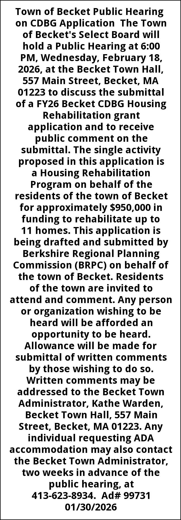 Town of Becket Public Hearing on CDBG Application The Town of Becket's Select Board will hold a Public Hearing at 6:00 PM, Wednesday, February 18, 2026, at the Becket Town Hall, 557 Main Street, Becket, MA 01223 to discuss the submittal of a FY26 Becket CDBG Housing Rehabilitation grant application and to receive public comment on the submittal. The single activity proposed in this application is a Housing Rehabilitation Program on behalf of the residents of the town of Becket for approximately $950,000 in funding to rehabilitate up to 11 homes. This application is being drafted and submitted by Berkshire Regional Planning Commission (BRPC) on behalf of the town of Becket. Residents of the town are invited to attend and comment. Any person or organization wishing to be heard will be afforded an opportunity to be heard. Allowance will be made for submittal of written comments by those wishing to do so. Written comments may be addressed to the Becket Town Administrator, Kathe Warden, Becket Town Hall, 557 Main Street, Becket, MA 01223. Any individual requesting ADA accommodation may also contact the Becket Town Administrator, two weeks in advance of the public hearing, at 413-623-8934. Ad# 99731 01/30/2026