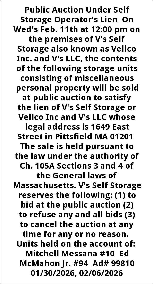Public Auction Under Self Storage Operator's Lien On Wed's Feb. 11th at 12:00 pm on the premises of V's Self Storage also known as Vellco Inc. and V's LLC, the contents of the following storage units consisting of miscellaneous personal property will be sold at public auction to satisfy the lien of V's Self Storage or Vellco Inc and V's LLC whose legal address is 1649 East Street in Pittsfield MA 01201 The sale is held pursuant to the law under the authority of Ch. 105A Sections 3 and 4 of the General laws of Massachusetts. V's Self Storage reserves the following: (1) to bid at the public auction (2) to refuse any and all bids (3) to cancel the auction at any time for any or no reason. Units held on the account of: Mitchell Messana #10 Ed McMahon Jr. #94 Ad# 99810 01/30/2026, 02/06/2026