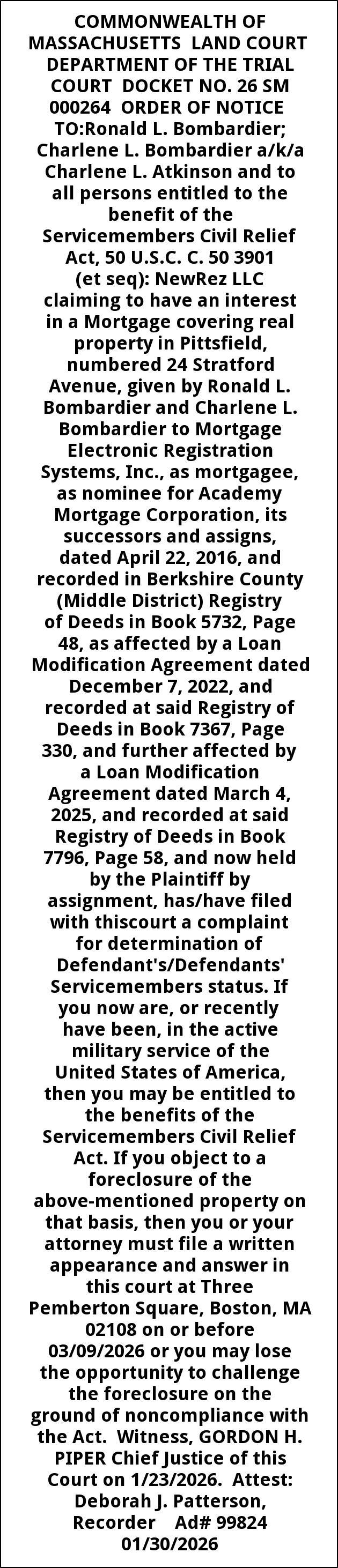 COMMONWEALTH OF MASSACHUSETTS LAND COURT DEPARTMENT OF THE TRIAL COURT DOCKET NO. 26 SM 000264 ORDER OF NOTICE TO:Ronald L. Bombardier; Charlene L. Bombardier a/k/a Charlene L. Atkinson and to all persons entitled to the benefit of the Servicemembers Civil Relief Act, 50 U.S.C. C. 50 3901 (et seq): NewRez LLC claiming to have an interest in a Mortgage covering real property in Pittsfield, numbered 24 Stratford Avenue, given by Ronald L. Bombardier and Charlene L. Bombardier to Mortgage Electronic Registration Systems, Inc., as mortgagee, as nominee for Academy Mortgage Corporation, its successors and assigns, dated April 22, 2016, and recorded in Berkshire County (Middle District) Registry of Deeds in Book 5732, Page 48, as affected by a Loan Modification Agreement dated December 7, 2022, and recorded at said Registry of Deeds in Book 7367, Page 330, and further affected by a Loan Modification Agreement dated March 4, 2025, and recorded at said Registry of Deeds in Book 7796, Page 58, and now held by the Plaintiff by assignment, has/have filed with thiscourt a complaint for determination of Defendant's/Defendants' Servicemembers status. If you now are, or recently have been, in the active military service of the United States of America, then you may be entitled to the benefits of the Servicemembers Civil Relief Act. If you object to a foreclosure of the above-mentioned property on that basis, then you or your attorney must file a written appearance and answer in this court at Three Pemberton Square, Boston, MA 02108 on or before 03/09/2026 or you may lose the opportunity to challenge the foreclosure on the ground of noncompliance with the Act. Witness, GORDON H. PIPER Chief Justice of this Court on 1/23/2026. Attest: Deborah J. Patterson, Recorder Ad# 99824 01/30/2026