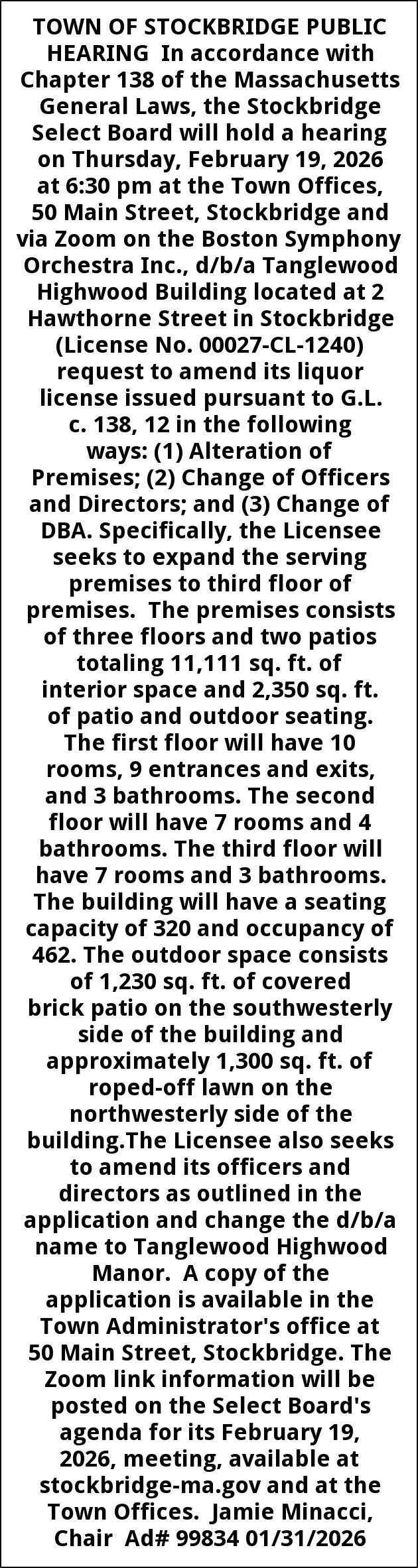 TOWN OF STOCKBRIDGE PUBLIC HEARING In accordance with Chapter 138 of the Massachusetts General Laws, the Stockbridge Select Board will hold a hearing on Thursday, February 19, 2026 at 6:30 pm at the Town Offices, 50 Main Street, Stockbridge and via Zoom on the Boston Symphony Orchestra Inc., d/b/a Tanglewood Highwood Building located at 2 Hawthorne Street in Stockbridge (License No. 00027-CL-1240) request to amend its liquor license issued pursuant to G.L. c. 138, 12 in the following ways: (1) Alteration of Premises; (2) Change of Officers and Directors; and (3) Change of DBA. Specifically, the Licensee seeks to expand the serving premises to third floor of premises. The premises consists of three floors and two patios totaling 11,111 sq. ft. of interior space and 2,350 sq. ft. of patio and outdoor seating. The first floor will have 10 rooms, 9 entrances and exits, and 3 bathrooms. The second floor will have 7 rooms and 4 bathrooms. The third floor will have 7 rooms and 3 bathrooms. The building will have a seating capacity of 320 and occupancy of 462. The outdoor space consists of 1,230 sq. ft. of covered brick patio on the southwesterly side of the building and approximately 1,300 sq. ft. of roped-off lawn on the northwesterly side of the building.The Licensee also seeks to amend its officers and directors as outlined in the application and change the d/b/a name to Tanglewood Highwood Manor. A copy of the application is available in the Town Administrator's office at 50 Main Street, Stockbridge. The Zoom link information will be posted on the Select Board's agenda for its February 19, 2026, meeting, available at stockbridge-ma.gov and at the Town Offices. Jamie Minacci, Chair Ad# 99834 01/31/2026