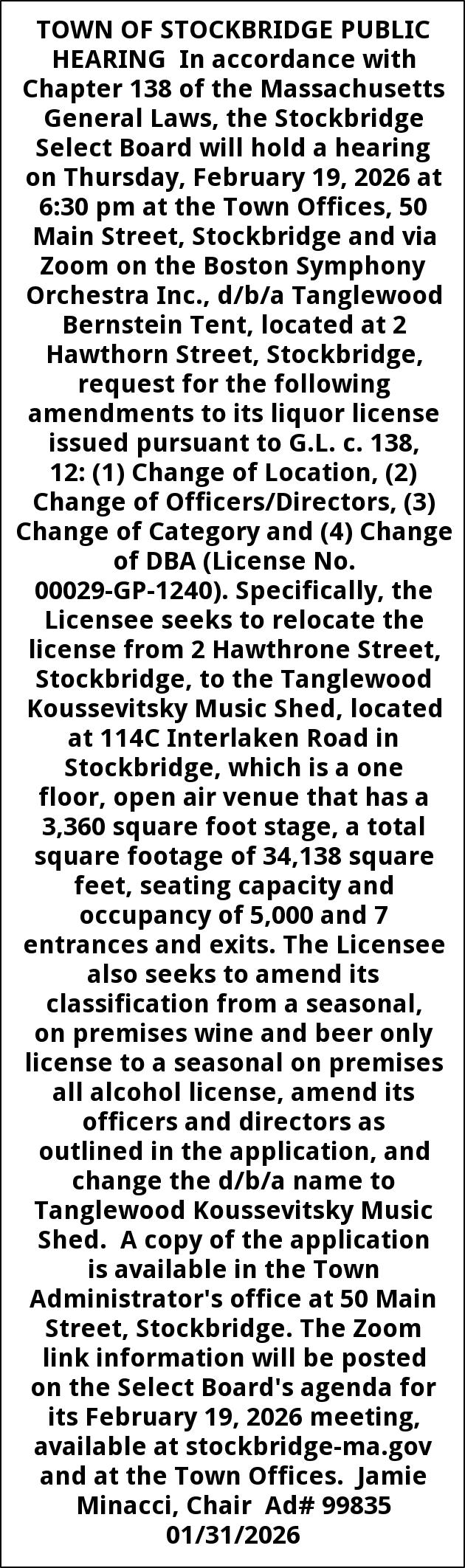 TOWN OF STOCKBRIDGE PUBLIC HEARING In accordance with Chapter 138 of the Massachusetts General Laws, the Stockbridge Select Board will hold a hearing on Thursday, February 19, 2026 at 6:30 pm at the Town Offices, 50 Main Street, Stockbridge and via Zoom on the Boston Symphony Orchestra Inc., d/b/a Tanglewood Bernstein Tent, located at 2 Hawthorn Street, Stockbridge, request for the following amendments to its liquor license issued pursuant to G.L. c. 138, 12: (1) Change of Location, (2) Change of Officers/Directors, (3) Change of Category and (4) Change of DBA (License No. 00029-GP-1240). Specifically, the Licensee seeks to relocate the license from 2 Hawthrone Street, Stockbridge, to the Tanglewood Koussevitsky Music Shed, located at 114C Interlaken Road in Stockbridge, which is a one floor, open air venue that has a 3,360 square foot stage, a total square footage of 34,138 square feet, seating capacity and occupancy of 5,000 and 7 entrances and exits. The Licensee also seeks to amend its classification from a seasonal, on premises wine and beer only license to a seasonal on premises all alcohol license, amend its officers and directors as outlined in the application, and change the d/b/a name to Tanglewood Koussevitsky Music Shed. A copy of the application is available in the Town Administrator's office at 50 Main Street, Stockbridge. The Zoom link information will be posted on the Select Board's agenda for its February 19, 2026 meeting, available at stockbridge-ma.gov and at the Town Offices. Jamie Minacci, Chair Ad# 99835 01/31/2026