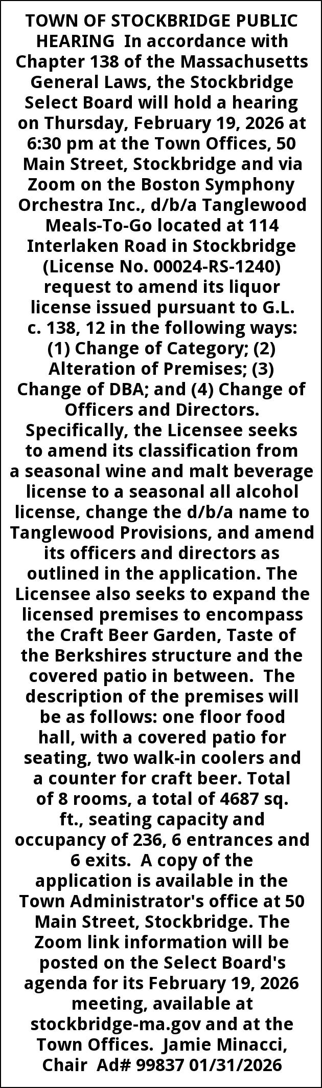 TOWN OF STOCKBRIDGE PUBLIC HEARING In accordance with Chapter 138 of the Massachusetts General Laws, the Stockbridge Select Board will hold a hearing on Thursday, February 19, 2026 at 6:30 pm at the Town Offices, 50 Main Street, Stockbridge and via Zoom on the Boston Symphony Orchestra Inc., d/b/a Tanglewood Meals-To-Go located at 114 Interlaken Road in Stockbridge (License No. 00024-RS-1240) request to amend its liquor license issued pursuant to G.L. c. 138, 12 in the following ways: (1) Change of Category; (2) Alteration of Premises; (3) Change of DBA; and (4) Change of Officers and Directors. Specifically, the Licensee seeks to amend its classification from a seasonal wine and malt beverage license to a seasonal all alcohol license, change the d/b/a name to Tanglewood Provisions, and amend its officers and directors as outlined in the application. The Licensee also seeks to expand the licensed premises to encompass the Craft Beer Garden, Taste of the Berkshires structure and the covered patio in between. The description of the premises will be as follows: one floor food hall, with a covered patio for seating, two walk-in coolers and a counter for craft beer. Total of 8 rooms, a total of 4687 sq. ft., seating capacity and occupancy of 236, 6 entrances and 6 exits. A copy of the application is available in the Town Administrator's office at 50 Main Street, Stockbridge. The Zoom link information will be posted on the Select Board's agenda for its February 19, 2026 meeting, available at stockbridge-ma.gov and at the Town Offices. Jamie Minacci, Chair Ad# 99837 01/31/2026
