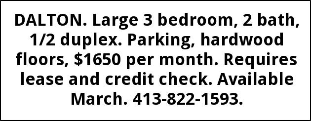 DALTON. Large 3 bedroom, 2 bath, 1/2 duplex. Parking, hardwood floors, $1650 per month. Requires lease and credit check. Available March. 413-822-1593.
