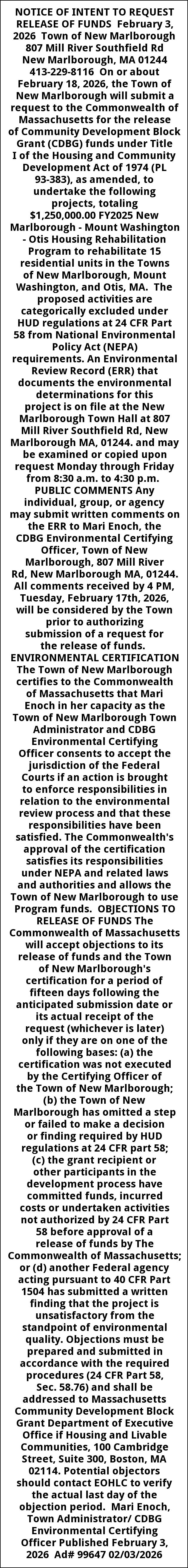 NOTICE OF INTENT TO REQUEST RELEASE OF FUNDS February 3, 2026 Town of New Marlborough 807 Mill River Southfield Rd New Marlborough, MA 01244 413-229-8116 On or about February 18, 2026, the Town of New Marlborough will submit a request to the Commonwealth of Massachusetts for the release of Community Development Block Grant (CDBG) funds under Title I of the Housing and Community Development Act of 1974 (PL 93-383), as amended, to undertake the following projects, totaling $1,250,000.00 FY2025 New Marlborough - Mount Washington - Otis Housing Rehabilitation Program to rehabilitate 15 residential units in the Towns of New Marlborough, Mount Washington, and Otis, MA. The proposed activities are categorically excluded under HUD regulations at 24 CFR Part 58 from National Environmental Policy Act (NEPA) requirements. An Environmental Review Record (ERR) that documents the environmental determinations for this project is on file at the New Marlborough Town Hall at 807 Mill River Southfield Rd, New Marlborough MA, 01244. and may be examined or copied upon request Monday through Friday from 8:30 a.m. to 4:30 p.m. PUBLIC COMMENTS Any individual, group, or agency may submit written comments on the ERR to Mari Enoch, the CDBG Environmental Certifying Officer, Town of New Marlborough, 807 Mill River Rd, New Marlborough MA, 01244. All comments received by 4 PM, Tuesday, February 17th, 2026, will be considered by the Town prior to authorizing submission of a request for the release of funds. ENVIRONMENTAL CERTIFICATION The Town of New Marlborough certifies to the Commonwealth of Massachusetts that Mari Enoch in her capacity as the Town of New Marlborough Town Administrator and CDBG Environmental Certifying Officer consents to accept the jurisdiction of the Federal Courts if an action is brought to enforce responsibilities in relation to the environmental review process and that these responsibilities have been satisfied. The Commonwealth's approval of the certification satisfies its responsibilities under NEPA and related laws and authorities and allows the Town of New Marlborough to use Program funds. OBJECTIONS TO RELEASE OF FUNDS The Commonwealth of Massachusetts will accept objections to its release of funds and the Town of New Marlborough's certification for a period of fifteen days following the anticipated submission date or its actual receipt of the request (whichever is later) only if they are on one of the following bases: (a) the certification was not executed by the Certifying Officer of the Town of New Marlborough; (b) the Town of New Marlborough has omitted a step or failed to make a decision or finding required by HUD regulations at 24 CFR part 58; (c) the grant recipient or other participants in the development process have committed funds, incurred costs or undertaken activities not authorized by 24 CFR Part 58 before approval of a release of funds by The Commonwealth of Massachusetts; or (d) another Federal agency acting pursuant to 40 CFR Part 1504 has submitted a written finding that the project is unsatisfactory from the standpoint of environmental quality. Objections must be prepared and submitted in accordance with the required procedures (24 CFR Part 58, Sec. 58.76) and shall be addressed to Massachusetts Community Development Block Grant Department of Executive Office if Housing and Livable Communities, 100 Cambridge Street, Suite 300, Boston, MA 02114. Potential objectors should contact EOHLC to verify the actual last day of the objection period. Mari Enoch, Town Administrator/ CDBG Environmental Certifying Officer Published February 3, 2026 Ad# 99647 02/03/2026