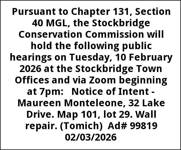 Pursuant to Chapter 131, Section 40 MGL, the Stockbridge Conservation Commission will hold the following public hearings on Tuesday, 10 February 2026 at the Stockbridge Town Offices and via Zoom beginning at 7pm: Notice of Intent - Maureen Monteleone, 32 Lake Drive. Map 101, lot 29. Wall repair. (Tomich) Ad# 99819 02/03/2026