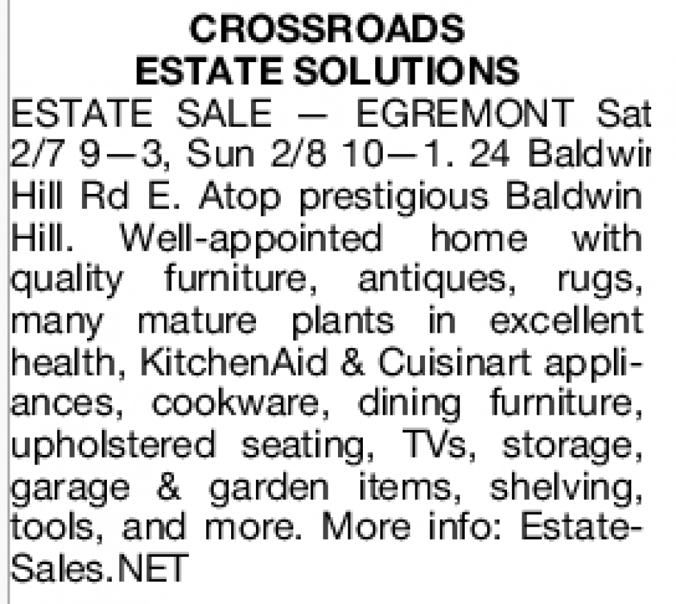 . Crossroads Estate Solutions - 24 Baldwin Hill Rd E, Egremont MA General Ads from The Berkshire Eagle ShopLocal