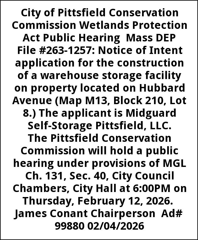 City of Pittsfield Conservation Commission Wetlands Protection Act Public Hearing Mass DEP File #263-1257: Notice of Intent application for the construction of a warehouse storage facility on property located on Hubbard Avenue (Map M13, Block 210, Lot 8.) The applicant is Midguard Self-Storage Pittsfield, LLC. The Pittsfield Conservation Commission will hold a public hearing under provisions of MGL Ch. 131, Sec. 40, City Council Chambers, City Hall at 6:00PM on Thursday, February 12, 2026. James Conant Chairperson Ad# 99880 02/04/2026