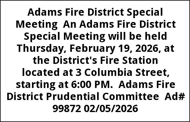 Adams Fire District Special Meeting An Adams Fire District Special Meeting will be held Thursday, February 19, 2026, at the District's Fire Station located at 3 Columbia Street, starting at 6:00 PM. Adams Fire District Prudential Committee Ad# 99872 02/05/2026