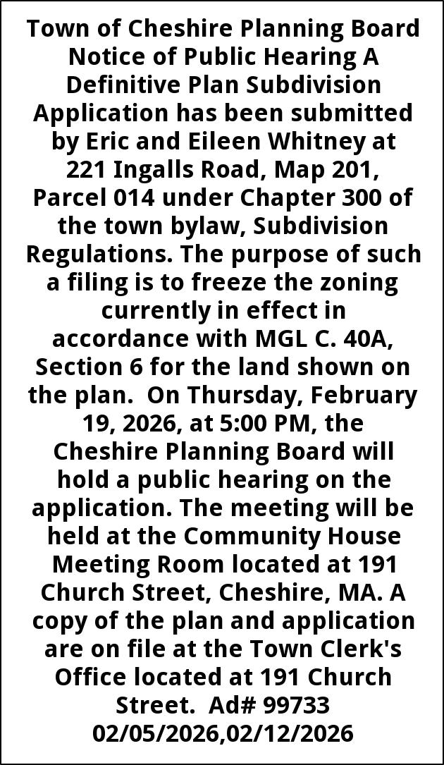 Town of Cheshire Planning Board Notice of Public Hearing A Definitive Plan Subdivision Application has been submitted by Eric and Eileen Whitney at 221 Ingalls Road, Map 201, Parcel 014 under Chapter 300 of the town bylaw, Subdivision Regulations. The purpose of such a filing is to freeze the zoning currently in effect in accordance with MGL C. 40A, Section 6 for the land shown on the plan. On Thursday, February 19, 2026, at 5:00 PM, the Cheshire Planning Board will hold a public hearing on the application. The meeting will be held at the Community House Meeting Room located at 191 Church Street, Cheshire, MA. A copy of the plan and application are on file at the Town Clerk's Office located at 191 Church Street. Ad# 99733 02/05/2026,02/12/2026