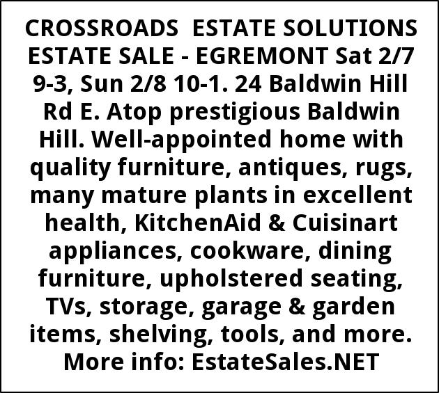 CROSSROADS ESTATE SOLUTIONS ESTATE SALE - EGREMONT Sat 2/7 9-3, Sun 2/8 10-1. 24 Baldwin Hill Rd E. Atop prestigious Baldwin Hill. Well-appointed home with quality furniture, antiques, rugs, many mature plants in excellent health, KitchenAid & Cuisinart appliances, cookware, dining furniture, upholstered seating, TVs, storage, garage & garden items, shelving, tools, and more. More info: EstateSales.NET