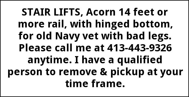 STAIR LIFTS, Acorn 14 feet or more rail, with hinged bottom, for old Navy vet with bad legs. Please call me at 413-443-9326 anytime. I have a qualified person to remove & pickup at your time frame.