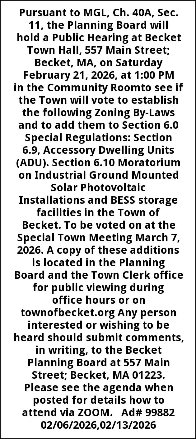 Pursuant to MGL, Ch. 40A, Sec. 11, the Planning Board will hold a Public Hearing at Becket Town Hall, 557 Main Street; Becket, MA, on Saturday February 21, 2026, at 1:00 PM in the Community Roomto see if the Town will vote to establish the following Zoning By-Laws and to add them to Section 6.0 Special Regulations: Section 6.9, Accessory Dwelling Units (ADU). Section 6.10 Moratorium on Industrial Ground Mounted Solar Photovoltaic Installations and BESS storage facilities in the Town of Becket. To be voted on at the Special Town Meeting March 7, 2026. A copy of these additions is located in the Planning Board and the Town Clerk office for public viewing during office hours or on townofbecket.org Any person interested or wishing to be heard should submit comments, in writing, to the Becket Planning Board at 557 Main Street; Becket, MA 01223. Please see the agenda when posted for details how to attend via ZOOM. Ad# 99882 02/06/2026,02/13/2026