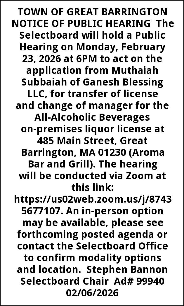 TOWN OF GREAT BARRINGTON NOTICE OF PUBLIC HEARING The Selectboard will hold a Public Hearing on Monday, February 23, 2026 at 6PM to act on the application from Muthaiah Subbaiah of Ganesh Blessing LLC, for transfer of license and change of manager for the All-Alcoholic Beverages on-premises liquor license at 485 Main Street, Great Barrington, MA 01230 (Aroma Bar and Grill). The hearing will be conducted via Zoom at this link: https://us02web.zoom.us/j/87435677107. An in-person option may be available, please see forthcoming posted agenda or contact the Selectboard Office to confirm modality options and location. Stephen Bannon Selectboard Chair Ad# 99940 02/06/2026