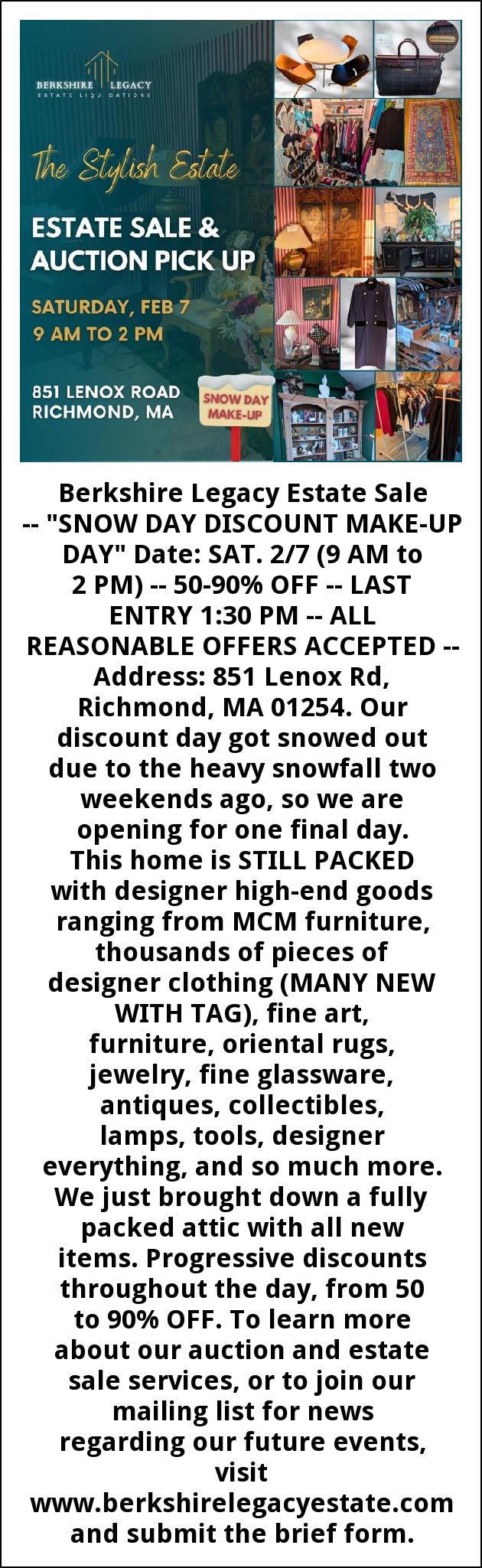 Berkshire Legacy Estate Sale -- "SNOW DAY DISCOUNT MAKE-UP DAY" Date: SAT. 2/7 (9 AM to 2 PM) -- 50-90% OFF -- LAST ENTRY 1:30 PM -- ALL REASONABLE OFFERS ACCEPTED -- Address: 851 Lenox Rd, Richmond, MA 01254. Our discount day got snowed out due to the heavy snowfall two weekends ago, so we are opening for one final day. This home is STILL PACKED with designer high-end goods ranging from MCM furniture, thousands of pieces of designer clothing (MANY NEW WITH TAG), fine art, furniture, oriental rugs, jewelry, fine glassware, antiques, collectibles, lamps, tools, designer everything, and so much more. We just brought down a fully packed attic with all new items. Progressive discounts throughout the day, from 50 to 90% OFF. To learn more about our auction and estate sale services, or to join our mailing list for news regarding our future events, visit www.berkshirelegacyestate.com and submit the brief form.