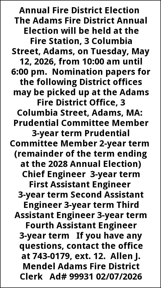 Annual Fire District Election The Adams Fire District Annual Election will be held at the Fire Station, 3 Columbia Street, Adams, on Tuesday, May 12, 2026, from 10:00 am until 6:00 pm. Nomination papers for the following District offices may be picked up at the Adams Fire District Office, 3 Columbia Street, Adams, MA: Prudential Committee Member 3-year term Prudential Committee Member 2-year term (remainder of the term ending at the 2028 Annual Election) Chief Engineer 3-year term First Assistant Engineer 3-year term Second Assistant Engineer 3-year term Third Assistant Engineer 3-year term Fourth Assistant Engineer 3-year term If you have any questions, contact the office at 743-0179, ext. 12. Allen J. Mendel Adams Fire District Clerk Ad# 99931 02/07/2026