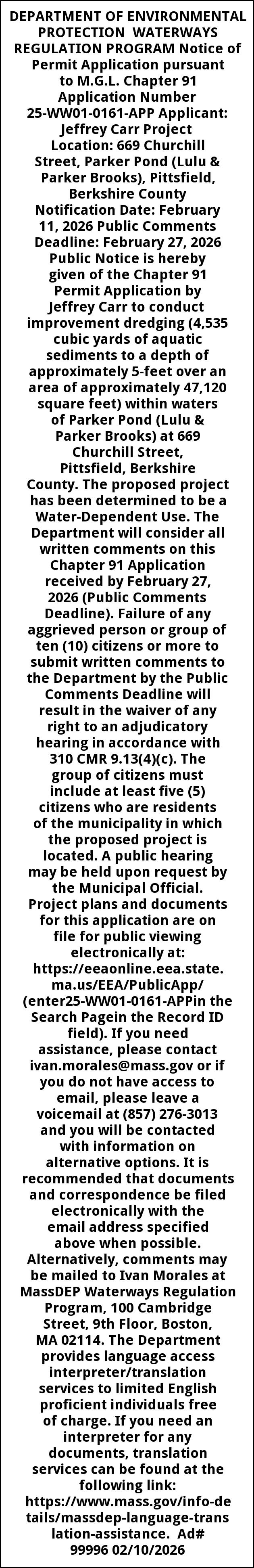 DEPARTMENT OF ENVIRONMENTAL PROTECTION WATERWAYS REGULATION PROGRAM Notice of Permit Application pursuant to M.G.L. Chapter 91 Application Number 25-WW01-0161-APP Applicant: Jeffrey Carr Project Location: 669 Churchill Street, Parker Pond (Lulu & Parker Brooks), Pittsfield, Berkshire County Notification Date: February 11, 2026 Public Comments Deadline: February 27, 2026 Public Notice is hereby given of the Chapter 91 Permit Application by Jeffrey Carr to conduct improvement dredging (4,535 cubic yards of aquatic sediments to a depth of approximately 5-feet over an area of approximately 47,120 square feet) within waters of Parker Pond (Lulu & Parker Brooks) at 669 Churchill Street, Pittsfield, Berkshire County. The proposed project has been determined to be a Water-Dependent Use. The Department will consider all written comments on this Chapter 91 Application received by February 27, 2026 (Public Comments Deadline). Failure of any aggrieved person or group of ten (10) citizens or more to submit written comments to the Department by the Public Comments Deadline will result in the waiver of any right to an adjudicatory hearing in accordance with 310 CMR 9.13(4)(c). The group of citizens must include at least five (5) citizens who are residents of the municipality in which the proposed project is located. A public hearing may be held upon request by the Municipal Official. Project plans and documents for this application are on file for public viewing electronically at: https://eeaonline.eea.state.ma.us/EEA/PublicApp/ (enter25-WW01-0161-APPin the Search Pagein the Record ID field). If you need assistance, please contact ivan.morales@mass.gov or if you do not have access to email, please leave a voicemail at (857) 276-3013 and you will be contacted with information on alternative options. It is recommended that documents and correspondence be filed electronically with the email address specified above when possible. Alternatively, comments may be mailed to Ivan Morales at MassDEP Waterways Regulation Program, 100 Cambridge Street, 9th Floor, Boston, MA 02114. The Department provides language access interpreter/translation services to limited English proficient individuals free of charge. If you need an interpreter for any documents, translation services can be found at the following link: https://www.mass.gov/info-details/massdep-language-translation-assistance. Ad# 99996 02/10/2026
