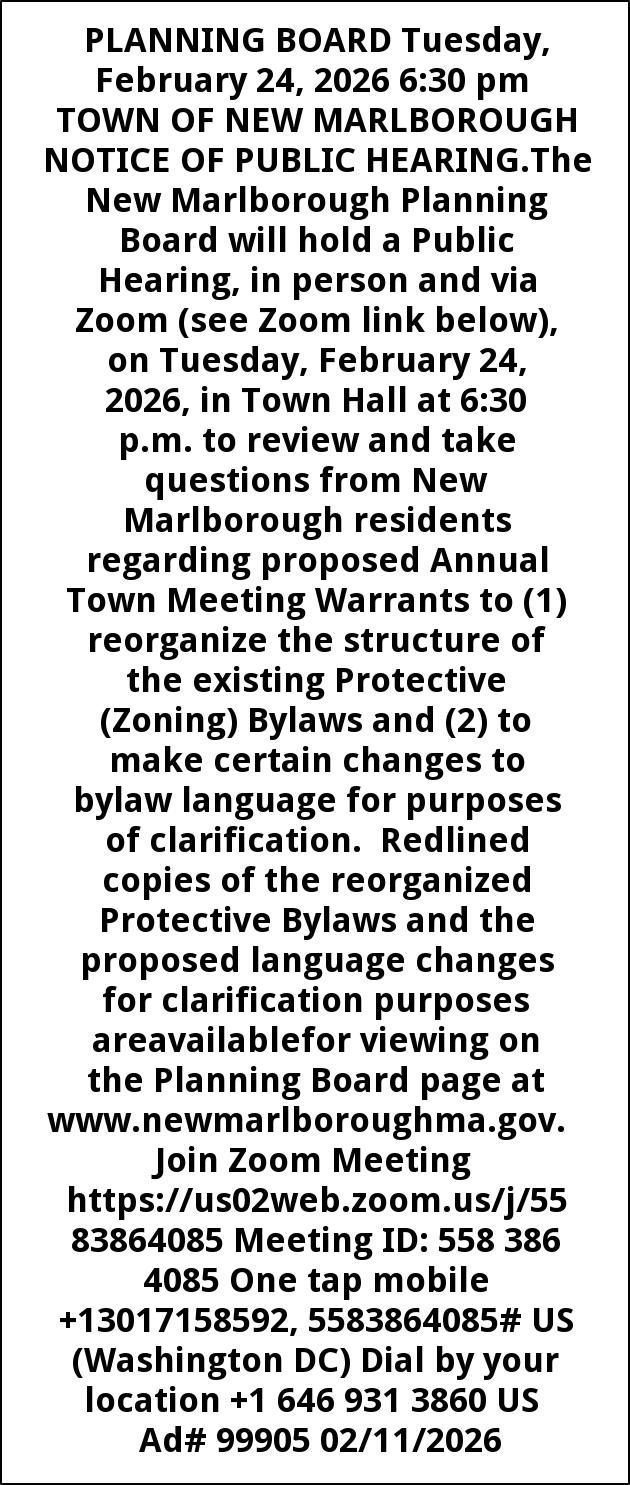 PLANNING BOARD Tuesday, February 24, 2026 6:30 pm TOWN OF NEW MARLBOROUGH NOTICE OF PUBLIC HEARING.The New Marlborough Planning Board will hold a Public Hearing, in person and via Zoom (see Zoom link below), on Tuesday, February 24, 2026, in Town Hall at 6:30 p.m. to review and take questions from New Marlborough residents regarding proposed Annual Town Meeting Warrants to (1) reorganize the structure of the existing Protective (Zoning) Bylaws and (2) to make certain changes to bylaw language for purposes of clarification. Redlined copies of the reorganized Protective Bylaws and the proposed language changes for clarification purposes areavailablefor viewing on the Planning Board page at www.newmarlboroughma.gov. Join Zoom Meeting https://us02web.zoom.us/j/5583864085 Meeting ID: 558 386 4085 One tap mobile +13017158592, 5583864085# US (Washington DC) Dial by your location +1 646 931 3860 US Ad# 99905 02/11/2026