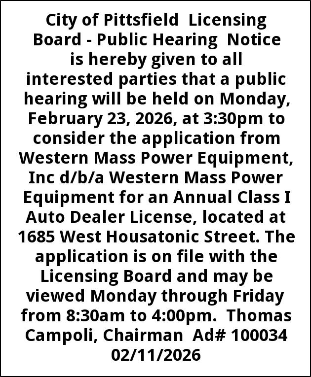 City of Pittsfield Licensing Board - Public Hearing Notice is hereby given to all interested parties that a public hearing will be held on Monday, February 23, 2026, at 3:30pm to consider the application from Western Mass Power Equipment, Inc d/b/a Western Mass Power Equipment for an Annual Class I Auto Dealer License, located at 1685 West Housatonic Street. The application is on file with the Licensing Board and may be viewed Monday through Friday from 8:30am to 4:00pm. Thomas Campoli, Chairman Ad# 100034 02/11/2026