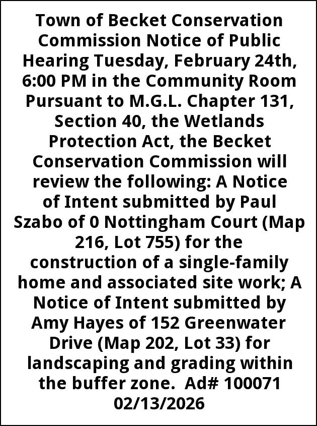 Town of Becket Conservation Commission Notice of Public Hearing Tuesday, February 24th, 6:00 PM in the Community Room Pursuant to M.G.L. Chapter 131, Section 40, the Wetlands Protection Act, the Becket Conservation Commission will review the following: A Notice of Intent submitted by Paul Szabo of 0 Nottingham Court (Map 216, Lot 755) for the construction of a single-family home and associated site work; A Notice of Intent submitted by Amy Hayes of 152 Greenwater Drive (Map 202, Lot 33) for landscaping and grading within the buffer zone. Ad# 100071 02/13/2026