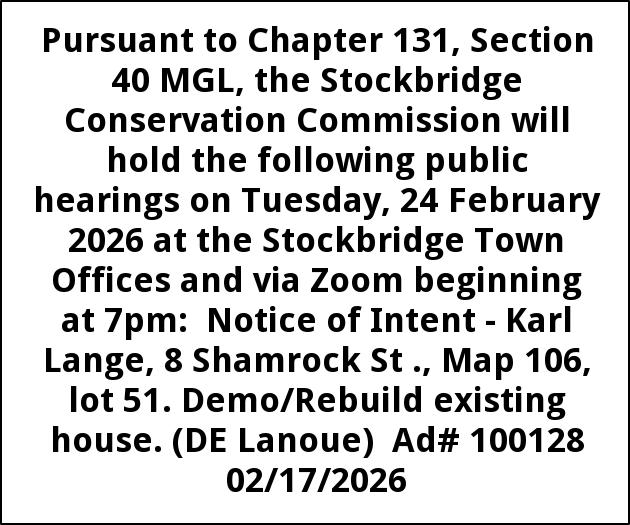 Pursuant to Chapter 131, Section 40 MGL, the Stockbridge Conservation Commission will hold the following public hearings on Tuesday, 24 February 2026 at the Stockbridge Town Offices and via Zoom beginning at 7pm: Notice of Intent - Karl Lange, 8 Shamrock St ., Map 106, lot 51. Demo/Rebuild existing house. (DE Lanoue) Ad# 100128 02/17/2026