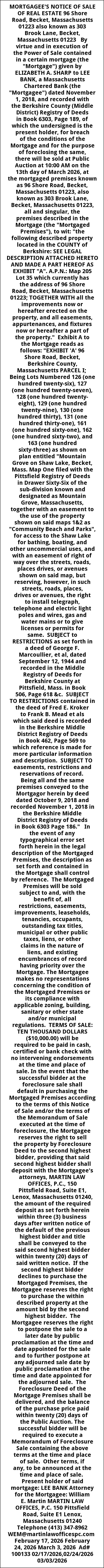 MORTGAGEE'S NOTICE OF SALE OF REAL ESTATE 96 Shore Road, Becket, Massachusetts 01223 also known as 303 Brook Lane, Becket, Massachusetts 01223 By virtue and in execution of the Power of Sale contained in a certain mortgage (the "Mortgage") given by ELIZABETH A. SHARP to LEE BANK, a Massachusetts Chartered Bank (the "Mortgagee") dated November 1, 2018, and recorded with the Berkshire County (Middle District) Registry of Deeds in Book 6303, Page 189, of which the undersigned is the present holder, for breach of the conditions of the Mortgage and for the purpose of foreclosing the same, there will be sold at Public Auction at 10:00 AM on the 13th day of March 2026, at the mortgaged premises known as 96 Shore Road, Becket, Massachusetts 01223, also known as 303 Brook Lane, Becket, Massachusetts 01223, all and singular, the premises described in the Mortgage (the "Mortgaged Premises"), to wit: "the following described property located in the COUNTY of Berkshire: SEE LEGAL DESCRIPTION ATTACHED HERETO AND MADE A PART HEREOF AS EXHIBIT "A". A.P.N.: Map 205 Lot 35 which currently has the address of 96 Shore Road, Becket, Massachusetts 01223; TOGETHER WITH all the improvements now or hereafter erected on the property, and all easements, appurtenances, and fixtures now or hereafter a part of the property." Exhibit A to the Mortgage reads as follows: "EXHIBIT 'A' 96 Shore Road, Becket, Berkshire County, Massachusetts PARCEL I; Being Lots Numbered 126 (one hundred twenty-six), 127 (one hundred twenty-seven), 128 (one hundred twenty- eight), 129 (one hundred twenty-nine), 130 (one hundred thirty), 131 (one hundred thirty-one), 161 (one hundred sixty-one), 162 (one hundred sixty-two), and 163 (one hundred sixty-three) as shown on plan entitled "Mountain Grove on Shaw Lake, Becket, Mass. Map One filed with the Pittsfield Registry of Deeds in Drawer Sixty-Six of the sub-division known and designated as Mountain Grove, Massachusetts, together with an easement to the use of the property shown on said maps 1&2 as "Community Beach and Parks", for access to the Shaw Lake for bathing, boating, and other uncommercial uses, and with an easement of right of way over the streets, roads, places drives, or avenues shown on said map, but reserving, however, in such streets, roads, places, drives or avenues, the right to install telegraph, telephone and electric light poles and wires, gas and water mains or to give licenses or permits for same. SUBJECT to RESTRICTIONS as set forth in a deed of George F. Marcoullier, et al, dated September 12, 1944 and recorded in the Middle Registry of Deeds for Berkshire County at Pittsfield, Mass. in Book 506, Page 618 &c. SUBJECT TO RESTRICTIONS contained in the deed of Fred E. Kroker to Frank B. Mead et als which said deed is recorded in the Berkshire Middle District Registry of Deeds in Book 462, Page 569 to which reference is made for more particular information and description. SUBJECT TO easements, restrictions and reservations of record. Being all and the same premises conveyed to the Mortgagor herein by deed dated October 9, 2018 and recorded November 1, 2018 in the Berkshire Middle District Registry of Deeds in Book 6303 Page 186." In the event of any typographical error set forth herein in the legal description of the Mortgaged Premises, the description as set forth and contained in the Mortgage shall control by reference. The Mortgaged Premises will be sold subject to and, with the benefit of, all restrictions, easements, improvements, leaseholds, tenancies, occupants, outstanding tax titles, municipal or other public taxes, liens, or other claims in the nature of liens, and existing encumbrances of record having priority over the Mortgage. The Mortgagee makes no representations concerning the condition of the Mortgaged Premises or its compliance with applicable zoning, building, sanitary or other state and/or municipal regulations. TERMS OF SALE: TEN THOUSAND DOLLARS ($10,000.00) will be required to be paid in cash, certified or bank check with no intervening endorsements at the time and place of sale. In the event that the successful bidder at the foreclosure sale shall default in purchasing the Mortgaged Premises according to the terms of this Notice of Sale and/or the terms of the Memorandum of Sale executed at the time of foreclosure, the Mortgagee reserves the right to sell the property by Foreclosure Deed to the second highest bidder, providing that said second highest bidder shall deposit with the Mortgagee's attorneys, MARTIN LAW OFFICES, P.C., 150 Pittsfield Road, Suite E1, Lenox, Massachusetts 01240, the amount of the required deposit as set forth herein within three (3) business days after written notice of the default of the previous highest bidder and title shall be conveyed to the said second highest bidder within twenty (20) days of said written notice. If the second highest bidder declines to purchase the Mortgaged Premises, the Mortgagee reserves the right to purchase the within described property at the amount bid by the second highest bidder. The Mortgagee reserves the right to postpone the sale to a later date by public proclamation at the time and date appointed for the sale and to further postpone at any adjourned sale date by public proclamation at the time and date appointed for the adjourned sale. The Foreclosure Deed of the Mortgage Premises shall be delivered, and the balance of the purchase price paid within twenty (20) days of the Public Auction. The successful bidder will be required to execute a Memorandum of Foreclosure Sale containing the above terms at the time and place of sale. Other terms, if any, to be announced at the time and place of sale. Present holder of said mortgage: LEE BANK Attorney for the Mortgagee: William E. Martin MARTIN LAW OFFICES, P.C. 150 Pittsfield Road, Suite E1 Lenox, Massachusetts 01240 Telephone (413) 347-8962 WEM@martinlawofficespc.com February 17, 2026 February 24, 2026 March 3, 2026 Ad# 100133 02/17/2026,02