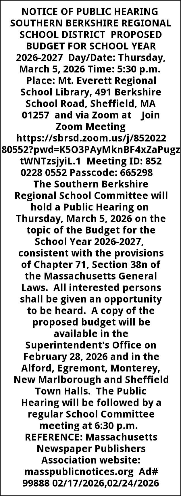 NOTICE OF PUBLIC HEARING SOUTHERN BERKSHIRE REGIONAL SCHOOL DISTRICT PROPOSED BUDGET FOR SCHOOL YEAR 2026-2027 Day/Date: Thursday, March 5, 2026 Time: 5:30 p.m. Place: Mt. Everett Regional School Library, 491 Berkshire School Road, Sheffield, MA 01257 and via Zoom at Join Zoom Meeting https://sbrsd.zoom.us/j/85202280552?pwd=K5O3PAyMknBF4xZaPugztWNTzsjyiL.1 Meeting ID: 852 0228 0552 Passcode: 665298 The Southern Berkshire Regional School Committee will hold a Public Hearing on Thursday, March 5, 2026 on the topic of the Budget for the School Year 2026-2027, consistent with the provisions of Chapter 71, Section 38n of the Massachusetts General Laws. All interested persons shall be given an opportunity to be heard. A copy of the proposed budget will be available in the Superintendent's Office on February 28, 2026 and in the Alford, Egremont, Monterey, New Marlborough and Sheffield Town Halls. The Public Hearing will be followed by a regular School Committee meeting at 6:30 p.m. REFERENCE: Massachusetts Newspaper Publishers Association website: masspublicnotices.org Ad# 99888 02/17/2026,02/24/2026