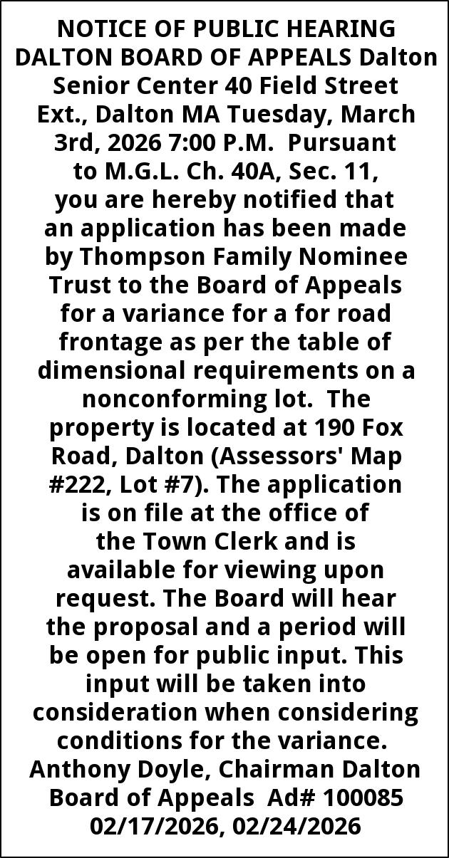 NOTICE OF PUBLIC HEARING DALTON BOARD OF APPEALS Dalton Senior Center 40 Field Street Ext., Dalton MA Tuesday, March 3rd, 2026 7:00 P.M. Pursuant to M.G.L. Ch. 40A, Sec. 11, you are hereby notified that an application has been made by Thompson Family Nominee Trust to the Board of Appeals for a variance for a for road frontage as per the table of dimensional requirements on a nonconforming lot. The property is located at 190 Fox Road, Dalton (Assessors' Map #222, Lot #7). The application is on file at the office of the Town Clerk and is available for viewing upon request. The Board will hear the proposal and a period will be open for public input. This input will be taken into consideration when considering conditions for the variance. Anthony Doyle, Chairman Dalton Board of Appeals Ad# 100085 02/17/2026, 02/24/2026