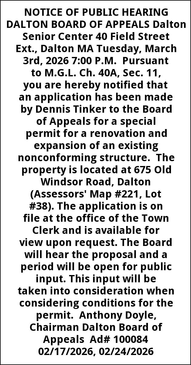 NOTICE OF PUBLIC HEARING DALTON BOARD OF APPEALS Dalton Senior Center 40 Field Street Ext., Dalton MA Tuesday, March 3rd, 2026 7:00 P.M. Pursuant to M.G.L. Ch. 40A, Sec. 11, you are hereby notified that an application has been made by Dennis Tinker to the Board of Appeals for a special permit for a renovation and expansion of an existing nonconforming structure. The property is located at 675 Old Windsor Road, Dalton (Assessors' Map #221, Lot #38). The application is on file at the office of the Town Clerk and is available for view upon request. The Board will hear the proposal and a period will be open for public input. This input will be taken into consideration when considering conditions for the permit. Anthony Doyle, Chairman Dalton Board of Appeals Ad# 100084 02/17/2026, 02/24/2026