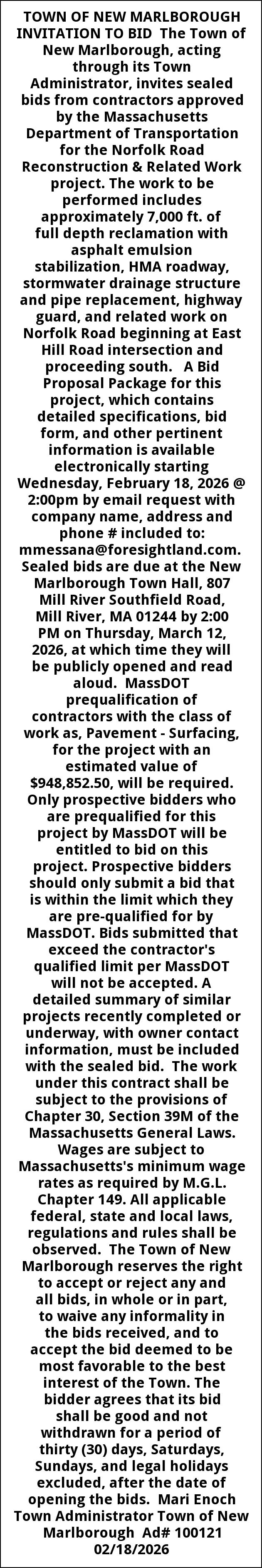 TOWN OF NEW MARLBOROUGH INVITATION TO BID The Town of New Marlborough, acting through its Town Administrator, invites sealed bids from contractors approved by the Massachusetts Department of Transportation for the Norfolk Road Reconstruction & Related Work project. The work to be performed includes approximately 7,000 ft. of full depth reclamation with asphalt emulsion stabilization, HMA roadway, stormwater drainage structure and pipe replacement, highway guard, and related work on Norfolk Road beginning at East Hill Road intersection and proceeding south. A Bid Proposal Package for this project, which contains detailed specifications, bid form, and other pertinent information is available electronically starting Wednesday, February 18, 2026 @ 2:00pm by email request with company name, address and phone # included to: mmessana@foresightland.com. Sealed bids are due at the New Marlborough Town Hall, 807 Mill River Southfield Road, Mill River, MA 01244 by 2:00 PM on Thursday, March 12, 2026, at which time they will be publicly opened and read aloud. MassDOT prequalification of contractors with the class of work as, Pavement - Surfacing, for the project with an estimated value of $948,852.50, will be required. Only prospective bidders who are prequalified for this project by MassDOT will be entitled to bid on this project. Prospective bidders should only submit a bid that is within the limit which they are pre-qualified for by MassDOT. Bids submitted that exceed the contractor's qualified limit per MassDOT will not be accepted. A detailed summary of similar projects recently completed or underway, with owner contact information, must be included with the sealed bid. The work under this contract shall be subject to the provisions of Chapter 30, Section 39M of the Massachusetts General Laws. Wages are subject to Massachusetts's minimum wage rates as required by M.G.L. Chapter 149. All applicable federal, state and local laws, regulations and rules shall be observed. The Town of New Marlborough reserves the right to accept or reject any and all bids, in whole or in part, to waive any informality in the bids received, and to accept the bid deemed to be most favorable to the best interest of the Town. The bidder agrees that its bid shall be good and not withdrawn for a period of thirty (30) days, Saturdays, Sundays, and legal holidays excluded, after the date of opening the bids. Mari Enoch Town Administrator Town of New Marlborough Ad# 100121 02/18/2026
