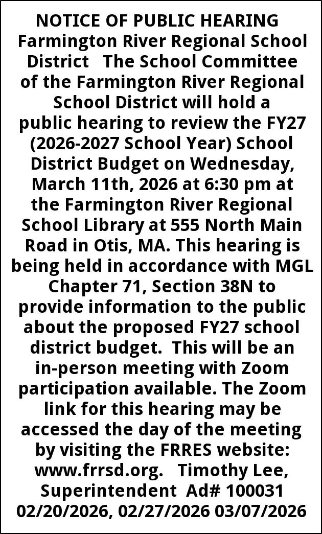 NOTICE OF PUBLIC HEARING Farmington River Regional School District The School Committee of the Farmington River Regional School District will hold a public hearing to review the FY27 (2026-2027 School Year) School District Budget on Wednesday, March 11th, 2026 at 6:30 pm at the Farmington River Regional School Library at 555 North Main Road in Otis, MA. This hearing is being held in accordance with MGL Chapter 71, Section 38N to provide information to the public about the proposed FY27 school district budget. This will be an in-person meeting with Zoom participation available. The Zoom link for this hearing may be accessed the day of the meeting by visiting the FRRES website: www.frrsd.org. Timothy Lee, Superintendent Ad# 100031 02/20/2026, 02/27/2026 03/07/2026