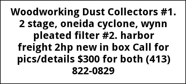 Woodworking Dust Collectors #1. 2 stage, oneida cyclone, wynn pleated filter #2. harbor freight 2hp new in box Call for pics/details $300 for both (413) 822-0829