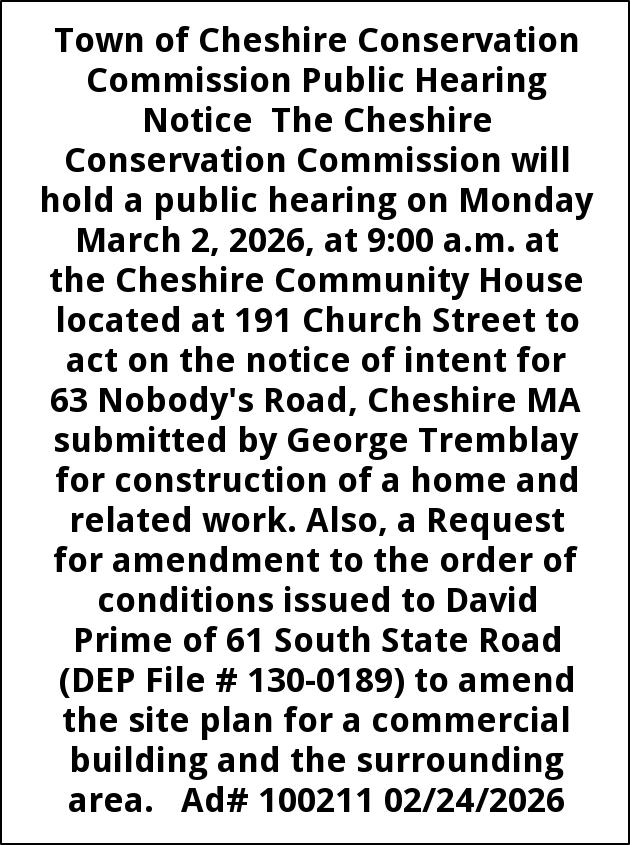 Town of Cheshire Conservation Commission Public Hearing Notice The Cheshire Conservation Commission will hold a public hearing on Monday March 2, 2026, at 9:00 a.m. at the Cheshire Community House located at 191 Church Street to act on the notice of intent for 63 Nobody's Road, Cheshire MA submitted by George Tremblay for construction of a home and related work. Also, a Request for amendment to the order of conditions issued to David Prime of 61 South State Road (DEP File # 130-0189) to amend the site plan for a commercial building and the surrounding area. Ad# 100211 02/24/2026