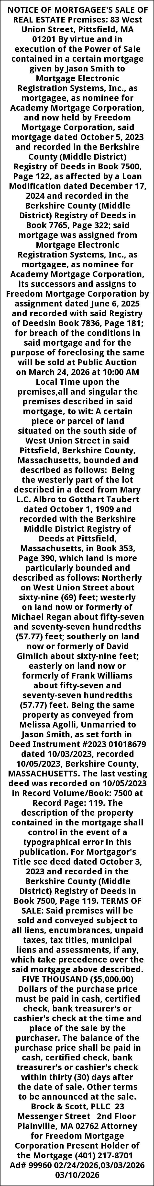 NOTICE OF MORTGAGEE'S SALE OF REAL ESTATE Premises: 83 West Union Street, Pittsfield, MA 01201 By virtue and in execution of the Power of Sale contained in a certain mortgage given by Jason Smith to Mortgage Electronic Registration Systems, Inc., as mortgagee, as nominee for Academy Mortgage Corporation, and now held by Freedom Mortgage Corporation, said mortgage dated October 5, 2023 and recorded in the Berkshire County (Middle District) Registry of Deeds in Book 7500, Page 122, as affected by a Loan Modification dated December 17, 2024 and recorded in the Berkshire County (Middle District) Registry of Deeds in Book 7765, Page 322; said mortgage was assigned from Mortgage Electronic Registration Systems, Inc., as mortgagee, as nominee for Academy Mortgage Corporation, its successors and assigns to Freedom Mortgage Corporation by assignment dated June 6, 2025 and recorded with said Registry of Deedsin Book 7836, Page 181; for breach of the conditions in said mortgage and for the purpose of foreclosing the same will be sold at Public Auction on March 24, 2026 at 10:00 AM Local Time upon the premises,all and singular the premises described in said mortgage, to wit: A certain piece or parcel of land situated on the south side of West Union Street in said Pittsfield, Berkshire County, Massachusetts, bounded and described as follows: Being the westerly part of the lot described in a deed from Mary L.C. Albro to Gotthart Taubert dated October 1, 1909 and recorded with the Berkshire Middle District Registry of Deeds at Pittsfield, Massachusetts, in Book 353, Page 390, which land is more particularly bounded and described as follows: Northerly on West Union Street about sixty-nine (69) feet; westerly on land now or formerly of Michael Regan about fifty-seven and seventy-seven hundredths (57.77) feet; southerly on land now or formerly of David Gimlich about sixty-nine feet; easterly on land now or formerly of Frank Williams about fifty-seven and seventy-seven hundredths (57.77) feet. Being the same property as conveyed from Melissa Agolli, Unmarried to Jason Smith, as set forth in Deed Instrument #2023 01018679 dated 10/03/2023, recorded 10/05/2023, Berkshire County, MASSACHUSETTS. The last vesting deed was recorded on 10/05/2023 in Record Volume/Book: 7500 at Record Page: 119. The description of the property contained in the mortgage shall control in the event of a typographical error in this publication. For Mortgagor's Title see deed dated October 3, 2023 and recorded in the Berkshire County (Middle District) Registry of Deeds in Book 7500, Page 119. TERMS OF SALE: Said premises will be sold and conveyed subject to all liens, encumbrances, unpaid taxes, tax titles, municipal liens and assessments, if any, which take precedence over the said mortgage above described. FIVE THOUSAND ($5,000.00) Dollars of the purchase price must be paid in cash, certified check, bank treasurer's or cashier's check at the time and place of the sale by the purchaser. The balance of the purchase price shall be paid in cash, certified check, bank treasurer's or cashier's check within thirty (30) days after the date of sale. Other terms to be announced at the sale. Brock & Scott, PLLC 23 Messenger Street 2nd Floor Plainville, MA 02762 Attorney for Freedom Mortgage Corporation Present Holder of the Mortgage (401) 217-8701 Ad# 99960 02/24/2026,03/03/2026 03/10/2026