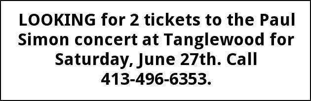 LOOKING for 2 tickets to the Paul Simon concert at Tanglewood for Saturday, June 27th. Call 413-496-6353.