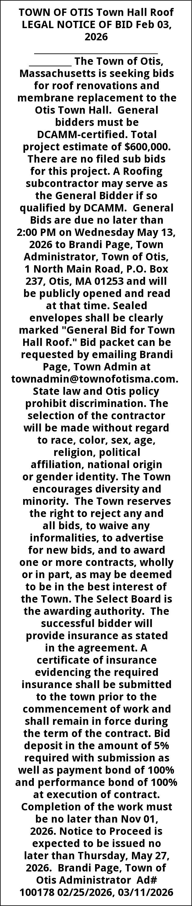 TOWN OF OTIS Town Hall Roof LEGAL NOTICE OF BID Feb 03, 2026 _______________________________________ The Town of Otis, Massachusetts is seeking bids for roof renovations and membrane replacement to the Otis Town Hall. General bidders must be DCAMM-certified. Total project estimate of $600,000. There are no filed sub bids for this project. A Roofing subcontractor may serve as the General Bidder if so qualified by DCAMM. General Bids are due no later than 2:00 PM on Wednesday May 13, 2026 to Brandi Page, Town Administrator, Town of Otis, 1 North Main Road, P.O. Box 237, Otis, MA 01253 and will be publicly opened and read at that time. Sealed envelopes shall be clearly marked "General Bid for Town Hall Roof." Bid packet can be requested by emailing Brandi Page, Town Admin at townadmin@townofotisma.com. State law and Otis policy prohibit discrimination. The selection of the contractor will be made without regard to race, color, sex, age, religion, political affiliation, national origin or gender identity. The Town encourages diversity and minority. The Town reserves the right to reject any and all bids, to waive any informalities, to advertise for new bids, and to award one or more contracts, wholly or in part, as may be deemed to be in the best interest of the Town. The Select Board is the awarding authority. The successful bidder will provide insurance as stated in the agreement. A certificate of insurance evidencing the required insurance shall be submitted to the town prior to the commencement of work and shall remain in force during the term of the contract. Bid deposit in the amount of 5% required with submission as well as payment bond of 100% and performance bond of 100% at execution of contract. Completion of the work must be no later than Nov 01, 2026. Notice to Proceed is expected to be issued no later than Thursday, May 27, 2026. Brandi Page, Town of Otis Administrator Ad# 100178 02/25/2026, 03/11/2026