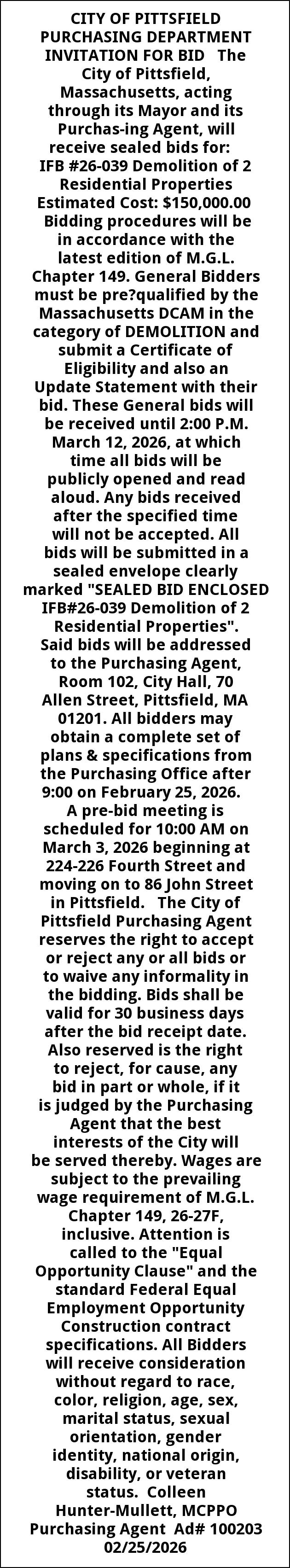 CITY OF PITTSFIELD PURCHASING DEPARTMENT INVITATION FOR BID The City of Pittsfield, Massachusetts, acting through its Mayor and its Purchas-ing Agent, will receive sealed bids for: IFB #26-039 Demolition of 2 Residential Properties Estimated Cost: $150,000.00 Bidding procedures will be in accordance with the latest edition of M.G.L. Chapter 149. General Bidders must be pre?qualified by the Massachusetts DCAM in the category of DEMOLITION and submit a Certificate of Eligibility and also an Update Statement with their bid. These General bids will be received until 2:00 P.M. March 12, 2026, at which time all bids will be publicly opened and read aloud. Any bids received after the specified time will not be accepted. All bids will be submitted in a sealed envelope clearly marked "SEALED BID ENCLOSED IFB#26-039 Demolition of 2 Residential Properties". Said bids will be addressed to the Purchasing Agent, Room 102, City Hall, 70 Allen Street, Pittsfield, MA 01201. All bidders may obtain a complete set of plans & specifications from the Purchasing Office after 9:00 on February 25, 2026. A pre-bid meeting is scheduled for 10:00 AM on March 3, 2026 beginning at 224-226 Fourth Street and moving on to 86 John Street in Pittsfield. The City of Pittsfield Purchasing Agent reserves the right to accept or reject any or all bids or to waive any informality in the bidding. Bids shall be valid for 30 business days after the bid receipt date. Also reserved is the right to reject, for cause, any bid in part or whole, if it is judged by the Purchasing Agent that the best interests of the City will be served thereby. Wages are subject to the prevailing wage requirement of M.G.L. Chapter 149, 26-27F, inclusive. Attention is called to the "Equal Opportunity Clause" and the standard Federal Equal Employment Opportunity Construction contract specifications. All Bidders will receive consideration without regard to race, color, religion, age, sex, marital status, sexual orientation, gender identity, national origin, disability, or veteran status. Colleen Hunter-Mullett, MCPPO Purchasing Agent Ad# 100203 02/25/2026