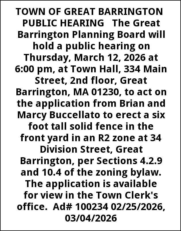TOWN OF GREAT BARRINGTON PUBLIC HEARING The Great Barrington Planning Board will hold a public hearing on Thursday, March 12, 2026 at 6:00 pm, at Town Hall, 334 Main Street, 2nd floor, Great Barrington, MA 01230, to act on the application from Brian and Marcy Buccellato to erect a six foot tall solid fence in the front yard in an R2 zone at 34 Division Street, Great Barrington, per Sections 4.2.9 and 10.4 of the zoning bylaw. The application is available for view in the Town Clerk's office. Ad# 100234 02/25/2026, 03/04/2026