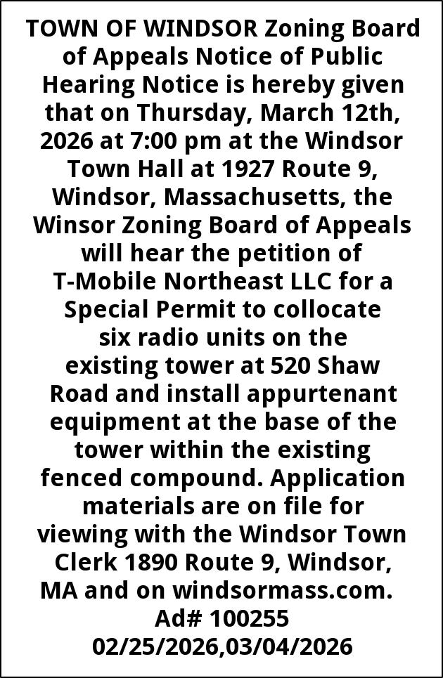 TOWN OF WINDSOR Zoning Board of Appeals Notice of Public Hearing Notice is hereby given that on Thursday, March 12th, 2026 at 7:00 pm at the Windsor Town Hall at 1927 Route 9, Windsor, Massachusetts, the Winsor Zoning Board of Appeals will hear the petition of T-Mobile Northeast LLC for a Special Permit to collocate six radio units on the existing tower at 520 Shaw Road and install appurtenant equipment at the base of the tower within the existing fenced compound. Application materials are on file for viewing with the Windsor Town Clerk 1890 Route 9, Windsor, MA and on windsormass.com. Ad# 100255 02/25/2026,03/04/2026