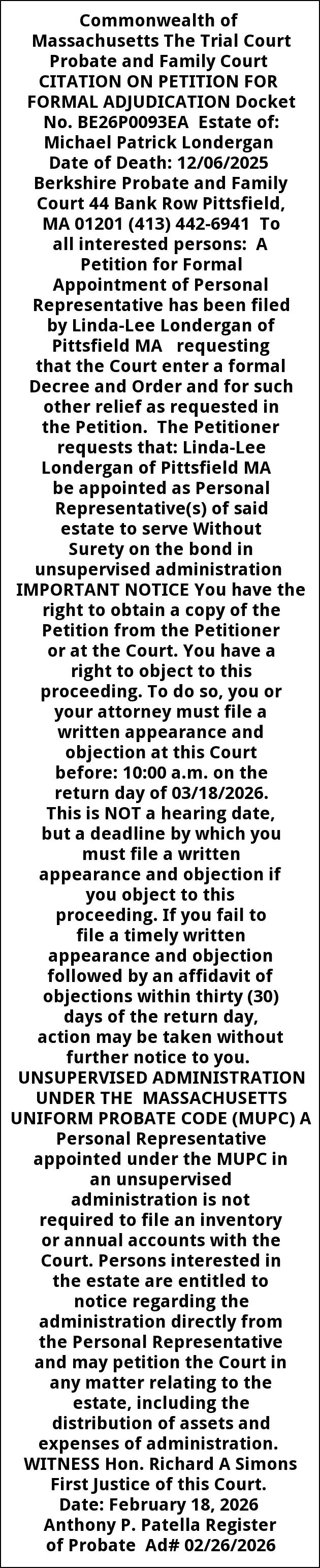 Commonwealth of Massachusetts The Trial Court Probate and Family Court CITATION ON PETITION FOR FORMAL ADJUDICATION Docket No. BE26P0093EA Estate of: Michael Patrick Londergan Date of Death: 12/06/2025 Berkshire Probate and Family Court 44 Bank Row Pittsfield, MA 01201 (413) 442-6941 To all interested persons: A Petition for Formal Appointment of Personal Representative has been filed by Linda-Lee Londergan of Pittsfield MA requesting that the Court enter a formal Decree and Order and for such other relief as requested in the Petition. The Petitioner requests that: Linda-Lee Londergan of Pittsfield MA be appointed as Personal Representative(s) of said estate to serve Without Surety on the bond in unsupervised administration IMPORTANT NOTICE You have the right to obtain a copy of the Petition from the Petitioner or at the Court. You have a right to object to this proceeding. To do so, you or your attorney must file a written appearance and objection at this Court before: 10:00 a.m. on the return day of 03/18/2026. This is NOT a hearing date, but a deadline by which you must file a written appearance and objection if you object to this proceeding. If you fail to file a timely written appearance and objection followed by an affidavit of objections within thirty (30) days of the return day, action may be taken without further notice to you. UNSUPERVISED ADMINISTRATION UNDER THE MASSACHUSETTS UNIFORM PROBATE CODE (MUPC) A Personal Representative appointed under the MUPC in an unsupervised administration is not required to file an inventory or annual accounts with the Court. Persons interested in the estate are entitled to notice regarding the administration directly from the Personal Representative and may petition the Court in any matter relating to the estate, including the distribution of assets and expenses of administration. WITNESS Hon. Richard A Simons First Justice of this Court. Date: February 18, 2026 Anthony P. Patella Register of Probate Ad# 02/26/2026