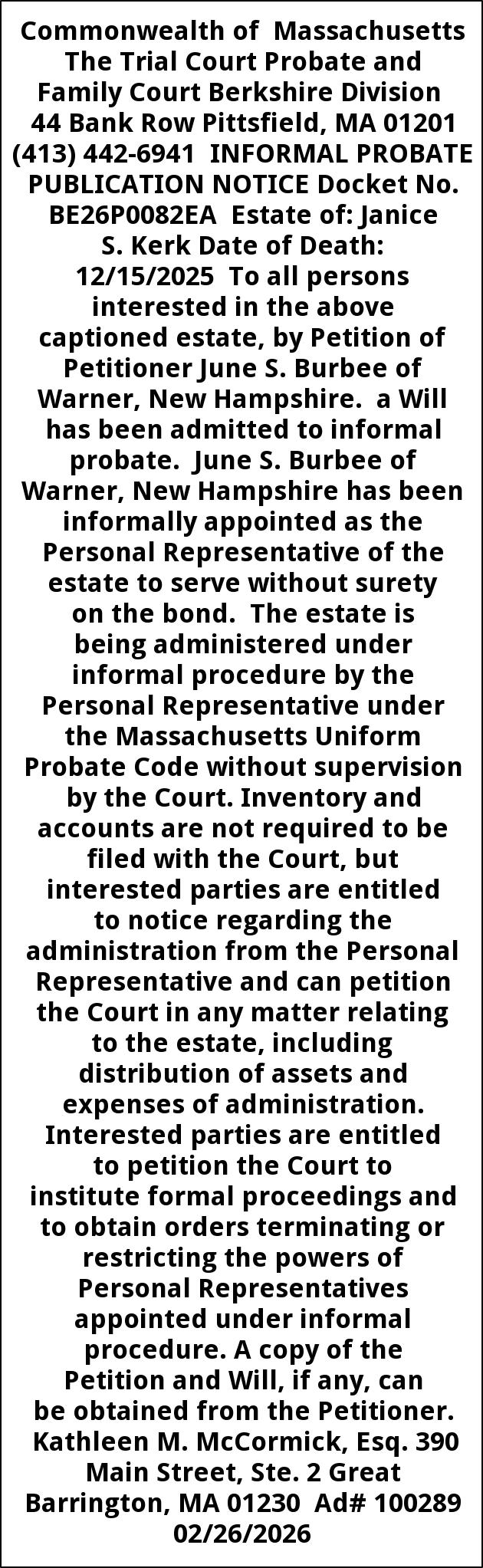 Commonwealth of Massachusetts The Trial Court Probate and Family Court Berkshire Division 44 Bank Row Pittsfield, MA 01201 (413) 442-6941 INFORMAL PROBATE PUBLICATION NOTICE Docket No. BE26P0082EA Estate of: Janice S. Kerk Date of Death: 12/15/2025 To all persons interested in the above captioned estate, by Petition of Petitioner June S. Burbee of Warner, New Hampshire. a Will has been admitted to informal probate. June S. Burbee of Warner, New Hampshire has been informally appointed as the Personal Representative of the estate to serve without surety on the bond. The estate is being administered under informal procedure by the Personal Representative under the Massachusetts Uniform Probate Code without supervision by the Court. Inventory and accounts are not required to be filed with the Court, but interested parties are entitled to notice regarding the administration from the Personal Representative and can petition the Court in any matter relating to the estate, including distribution of assets and expenses of administration. Interested parties are entitled to petition the Court to institute formal proceedings and to obtain orders terminating or restricting the powers of Personal Representatives appointed under informal procedure. A copy of the Petition and Will, if any, can be obtained from the Petitioner. Kathleen M. McCormick, Esq. 390 Main Street, Ste. 2 Great Barrington, MA 01230 Ad# 100289 02/26/2026