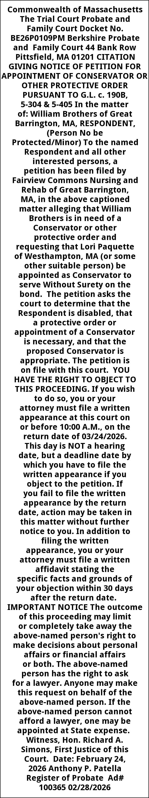 Commonwealth of Massachusetts The Trial Court Probate and Family Court Docket No. BE26P0109PM Berkshire Probate and Family Court 44 Bank Row Pittsfield, MA 01201 CITATION GIVING NOTICE OF PETITION FOR APPOINTMENT OF CONSERVATOR OR OTHER PROTECTIVE ORDER PURSUANT TO G.L. c. 190B, 5-304 & 5-405 In the matter of: William Brothers of Great Barrington, MA, RESPONDENT, (Person No be Protected/Minor) To the named Respondent and all other interested persons, a petition has been filed by Fairview Commons Nursing and Rehab of Great Barrington, MA, in the above captioned matter alleging that William Brothers is in need of a Conservator or other protective order and requesting that Lori Paquette of Westhampton, MA (or some other suitable person) be appointed as Conservator to serve Without Surety on the bond. The petition asks the court to determine that the Respondent is disabled, that a protective order or appointment of a Conservator is necessary, and that the proposed Conservator is appropriate. The petition is on file with this court. YOU HAVE THE RIGHT TO OBJECT TO THIS PROCEEDING. If you wish to do so, you or your attorney must file a written appearance at this court on or before 10:00 A.M., on the return date of 03/24/2026. This day is NOT a hearing date, but a deadline date by which you have to file the written appearance if you object to the petition. If you fail to file the written appearance by the return date, action may be taken in this matter without further notice to you. In addition to filing the written appearance, you or your attorney must file a written affidavit stating the specific facts and grounds of your objection within 30 days after the return date. IMPORTANT NOTICE The outcome of this proceeding may limit or completely take away the above-named person's right to make decisions about personal affairs or financial affairs or both. The above-named person has the right to ask for a lawyer. Anyone may make this request on behalf of the above-named person. If the above-named person cannot afford a lawyer, one may be appointed at State expense. Witness, Hon. Richard A. Simons, First Justice of this Court. Date: February 24, 2026 Anthony P. Patella Register of Probate Ad# 100365 02/28/2026