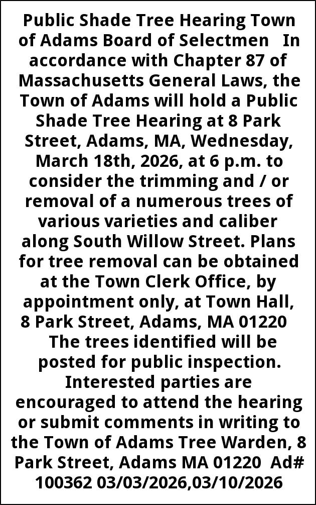 Public Shade Tree Hearing Town of Adams Board of Selectmen In accordance with Chapter 87 of Massachusetts General Laws, the Town of Adams will hold a Public Shade Tree Hearing at 8 Park Street, Adams, MA, Wednesday, March 18th, 2026, at 6 p.m. to consider the trimming and / or removal of a numerous trees of various varieties and caliber along South Willow Street. Plans for tree removal can be obtained at the Town Clerk Office, by appointment only, at Town Hall, 8 Park Street, Adams, MA 01220 The trees identified will be posted for public inspection. Interested parties are encouraged to attend the hearing or submit comments in writing to the Town of Adams Tree Warden, 8 Park Street, Adams MA 01220 Ad# 100362 03/03/2026,03/10/2026
