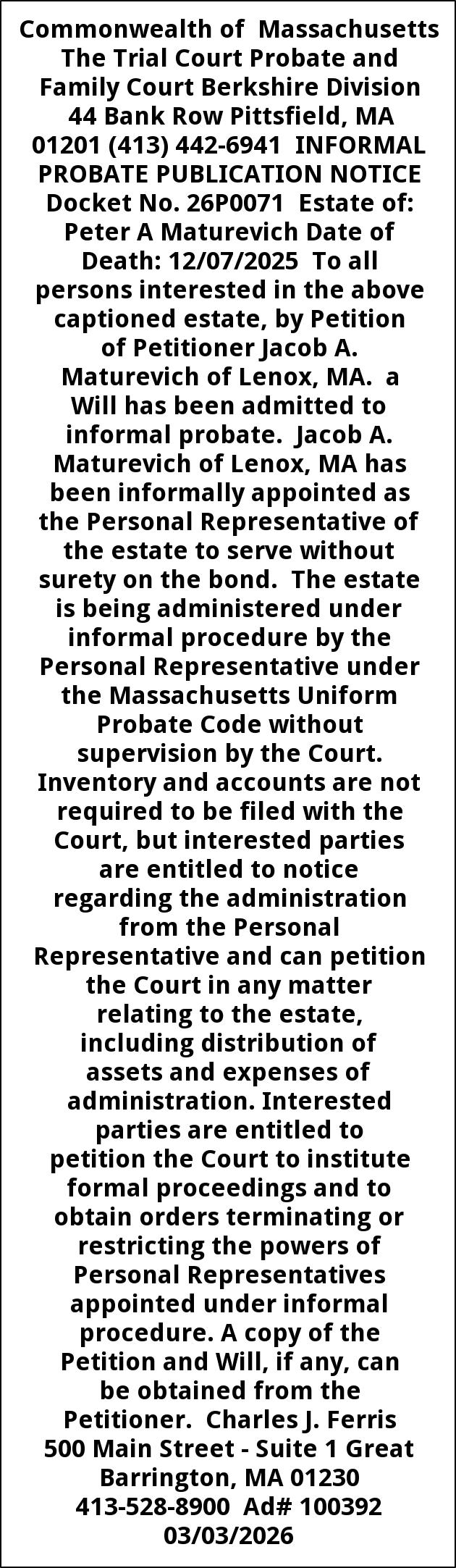Commonwealth of Massachusetts The Trial Court Probate and Family Court Berkshire Division 44 Bank Row Pittsfield, MA 01201 (413) 442-6941 INFORMAL PROBATE PUBLICATION NOTICE Docket No. 26P0071 Estate of: Peter A Maturevich Date of Death: 12/07/2025 To all persons interested in the above captioned estate, by Petition of Petitioner Jacob A. Maturevich of Lenox, MA. a Will has been admitted to informal probate. Jacob A. Maturevich of Lenox, MA has been informally appointed as the Personal Representative of the estate to serve without surety on the bond. The estate is being administered under informal procedure by the Personal Representative under the Massachusetts Uniform Probate Code without supervision by the Court. Inventory and accounts are not required to be filed with the Court, but interested parties are entitled to notice regarding the administration from the Personal Representative and can petition the Court in any matter relating to the estate, including distribution of assets and expenses of administration. Interested parties are entitled to petition the Court to institute formal proceedings and to obtain orders terminating or restricting the powers of Personal Representatives appointed under informal procedure. A copy of the Petition and Will, if any, can be obtained from the Petitioner. Charles J. Ferris 500 Main Street - Suite 1 Great Barrington, MA 01230 413-528-8900 Ad# 100392 03/03/2026